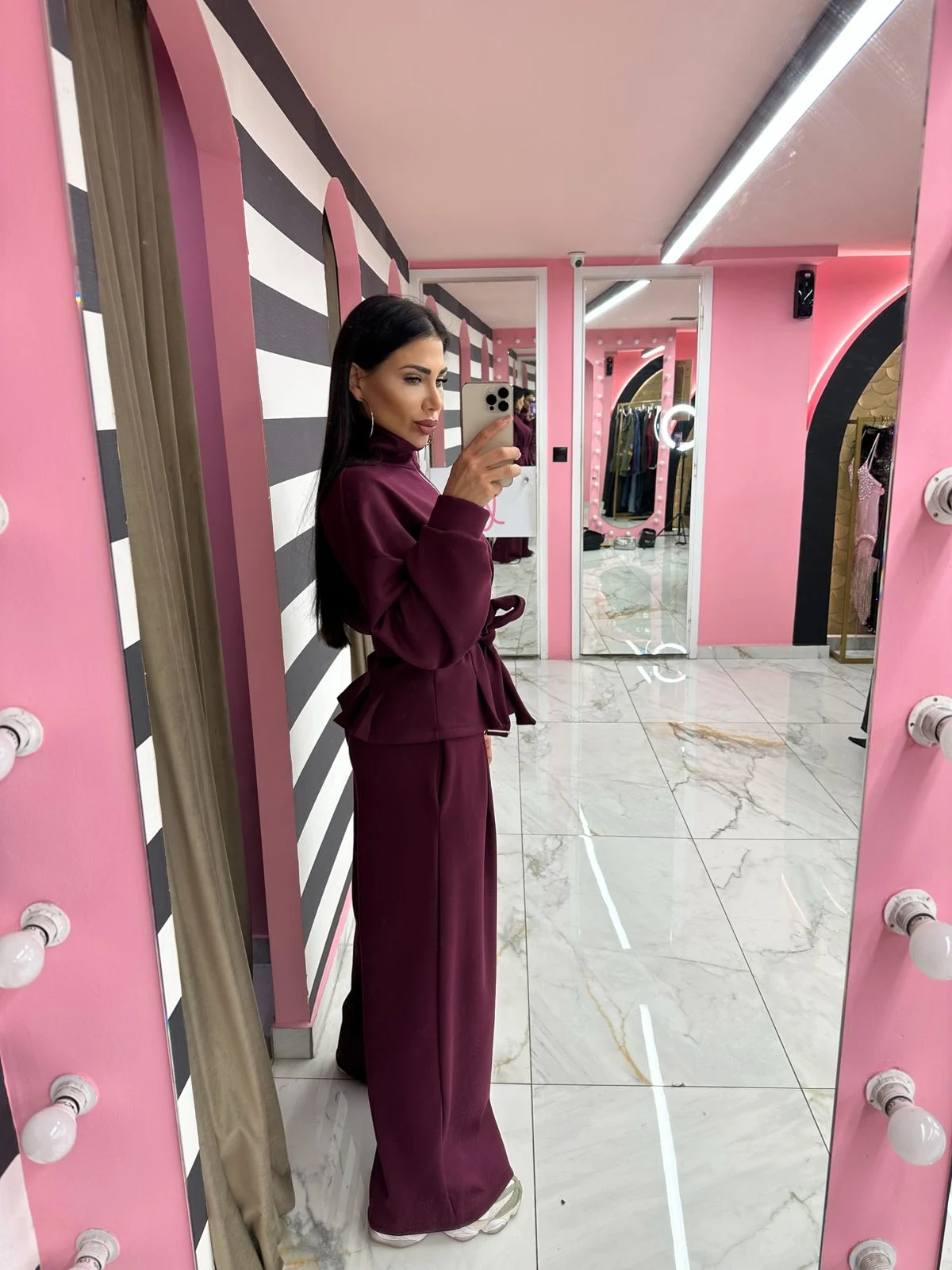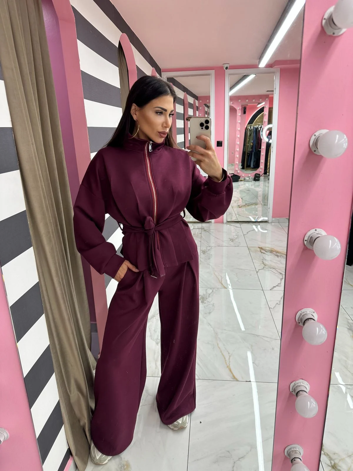 Σετ δύο τεμαχίων σε βαθύ μπορντό wine χρώμα με φερμουάρ και ζώνη που τονίζει τη μέση. Παντελόνι σε φαρδιά γραμμή και άψογη εφαρμογή, τέλειο για casual αλλά και πιο προσεγμένες εμφανίσεις. Απόλυτα κομψό και άνετο για κάθε ώρα.