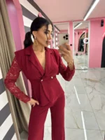 Ένα σετ σε βαθύ μπορντό, γεμάτο θηλυκότητα και ρομαντική διάθεση. Τα δαντελένια μανίκια προσθέτουν πολυτέλεια, ενώ η γραμμή του είναι κομψή και άνετη. Τέλειο για δείπνα, εξόδους ή πιο επίσημες στιγμές.