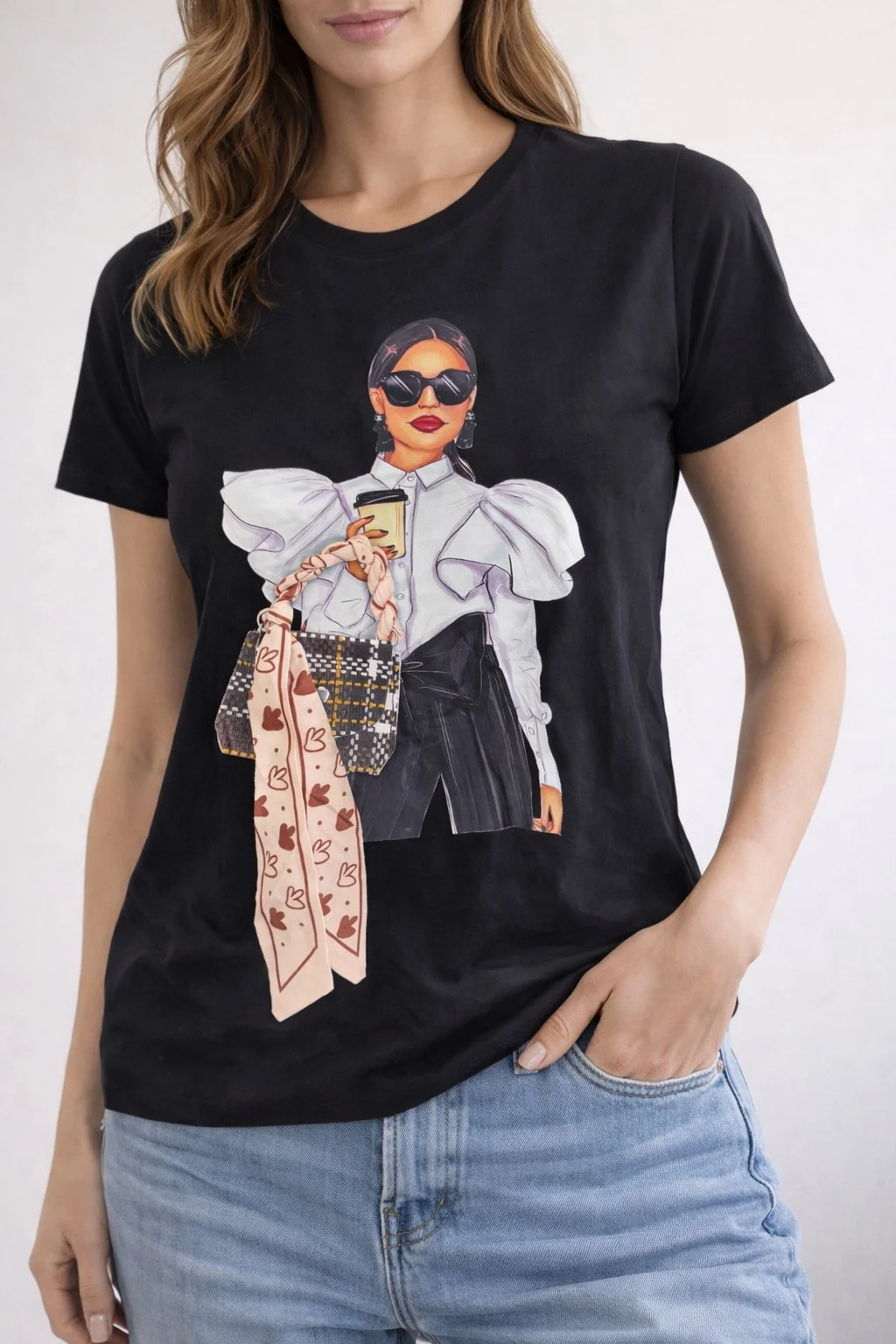 Stylish t-shirt με fashion illustration κοπέλας σε chic look, που κρατά καφέ και statement τσάντα. Μοντέρνο, girly και απόλυτα instagram-friendly κομμάτι που απογειώνει ακόμα και το πιο απλό outfit. Φόρεσέ το με jeans, shorts ή φούστα για effortless street style με fashion attitude