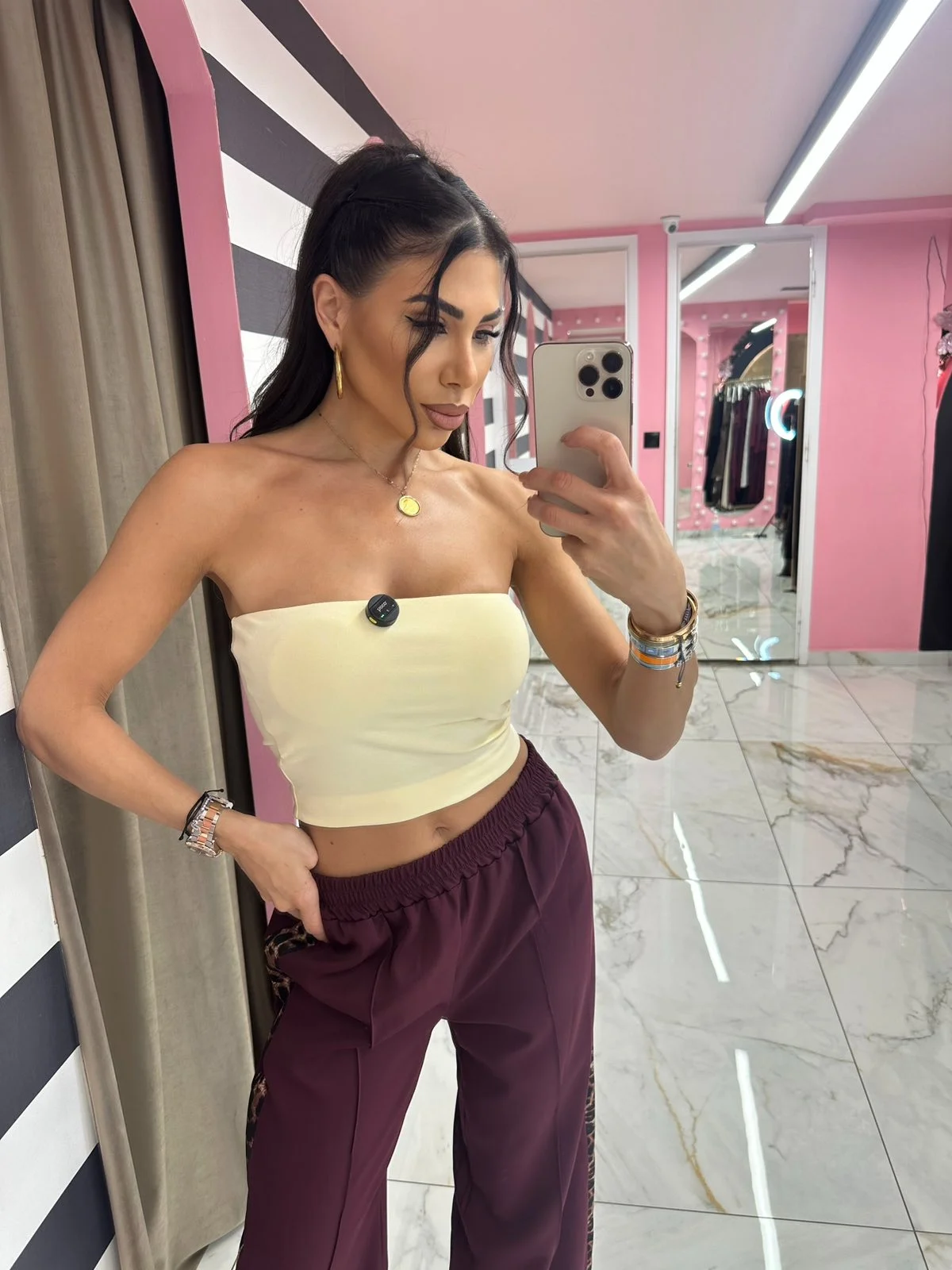 Strapless τοπ σε κίτρινο απόχρωση που χαρίζει φρεσκάδα και κομψότητα. Μαλακό και άνετο, φωτίζει το outfit και φοριέται εύκολα από το πρωί μέχρι το βράδυ.