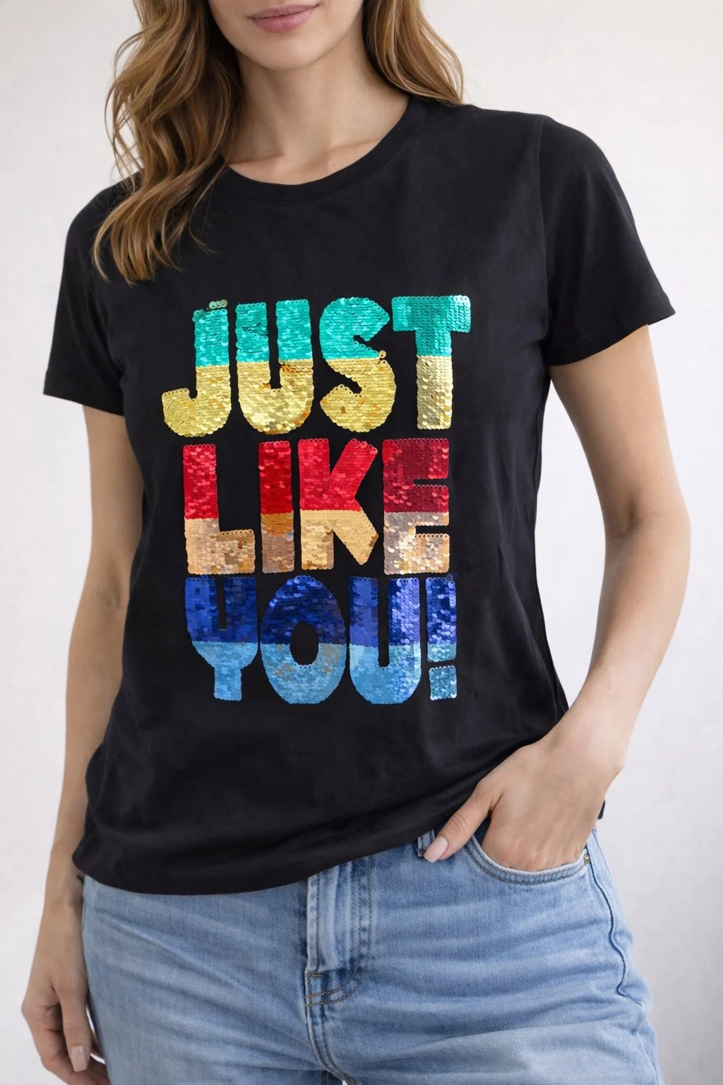 Βαμβακερό T-shirt με εντυπωσιακό πολύχρωμο σχέδιο από παγιέτες και το μήνυμα “Just Like You!” που δίνει fun και λαμπερό χαρακτήρα στο look. Άνετη γραμμή που φοριέται εύκολα όλη μέρα και συνδυάζεται τέλεια με jeans, σορτσάκια ή φούστες για casual αλλά ξεχωριστές εμφανίσεις.