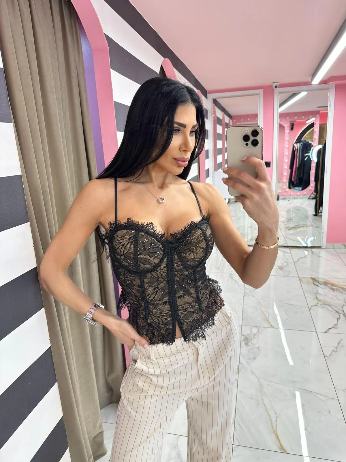 Ρομαντικό αλλά ταυτόχρονα ultra sexy κορσέ τοπ από δαντέλα με διαφάνειες που αγκαλιάζουν και αναδεικνύουν το σώμα. Διαθέτει ενίσχυση στο μπούστο για σταθερό κράτημα, λεπτές τιράντες και ελαφρώς peplum τελείωμα που κολακεύει τη μέση. Κλείσιμο στο πίσω μέρος για τέλεια εφαρμογή. Φοριέται μόνο του για βραδινές εμφανίσεις ή μέσα από σακάκι για chic & classy σύνολα.