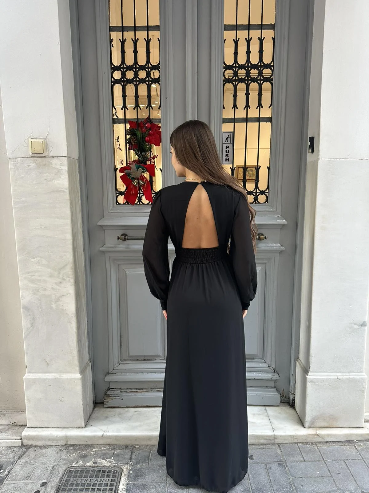 Μάξι φόρεμα σε κλασικό μαύρο χρώμα, απόλυτα κομψό και διαχρονικό. Διαθέτει βαθύ ντεκολτέ που αναδεικνύει το μπούστο, αέρινα μανίκια με άνοιγμα και εντυπωσιακό σκίσιμο στο πόδι για θηλυκή κίνηση. Ένα statement κομμάτι που φοριέται από βραδινές εξόδους έως επίσημες περιστάσεις.