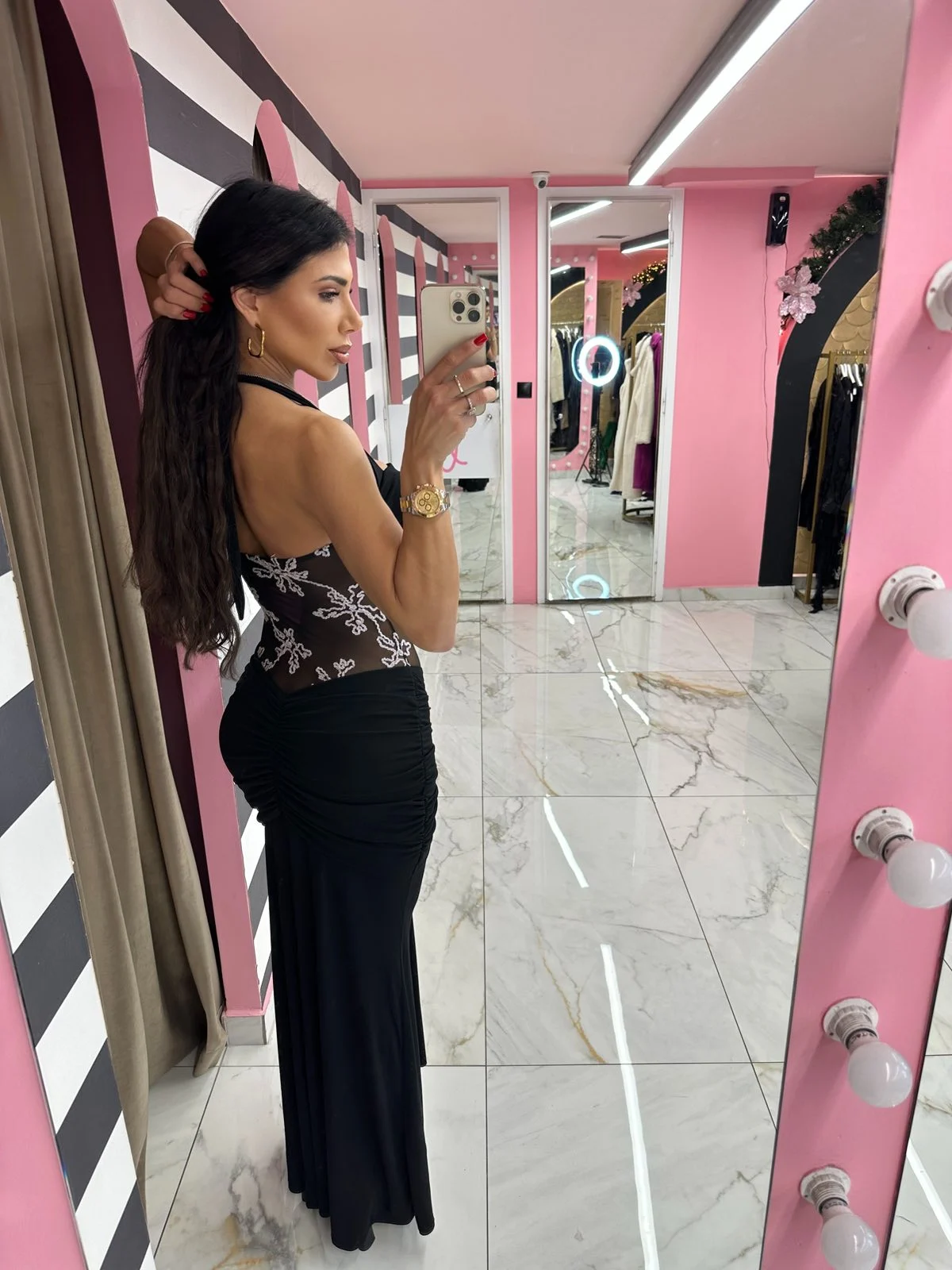 Maxi φόρεμα σε μαύρο χρώμα με halter λαιμόκοψη που αναδεικνύει το μπούστο και τη σιλουέτα. Διαθέτει εντυπωσιακό διάφανο mesh στο κέντρο με διακριτικό floral σχέδιο, προσφέροντας sexy αλλά κομψό αποτέλεσμα. Το κάτω μέρος αγκαλιάζει το σώμα με draped λεπτομέρειες που κολακεύουν τη μέση και τους γοφούς.