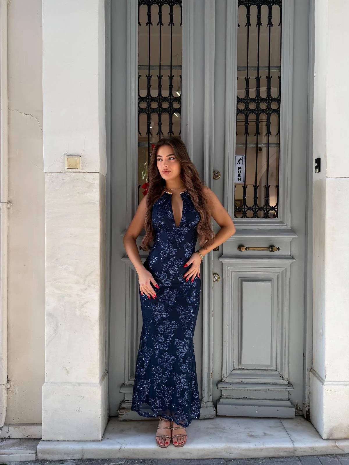 Εντυπωσιακό μάξι φόρεμα σε μπλε απόχρωση με διακριτική λάμψη και εφαρμοστή γραμμή. Το βαθύ ντεκολτέ και η ανοιχτή πλάτη δημιουργούν ένα κομψό αλλά ταυτόχρονα δυναμικό αποτέλεσμα, ιδανικό για βραδινές εμφανίσεις.