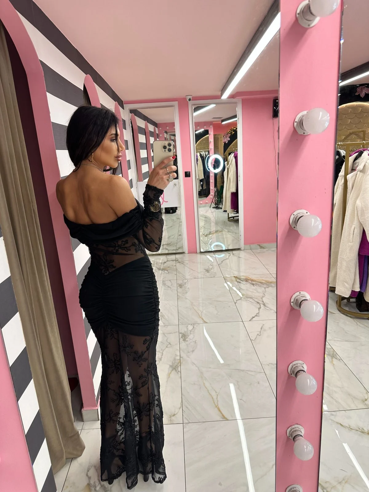 Maxi φόρεμα σε μαύρο χρώμα με off-shoulder λαιμόκοψη που αναδεικνύει τους ώμους και το ντεκολτέ. Διαθέτει εντυπωσιακό διάφανο mesh με floral λεπτομέρειες στο πάνω και κάτω μέρος, δημιουργώντας ένα άκρως θηλυκό και αισθησιακό αποτέλεσμα.