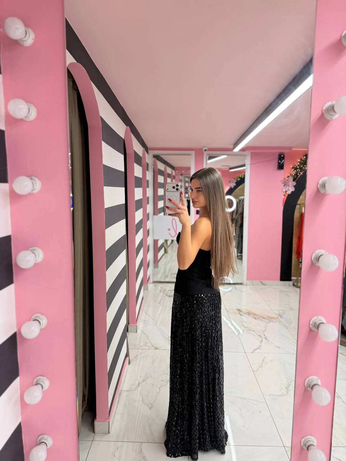 Εκρηκτικό maxi φόρεμα με εντυπωσιακή παγιέτα στο κάτω μέρος και structured κορμάκι που τονίζει τη μέση και το μπούστο. Η εφαρμογή του αγκαλιάζει το σώμα χωρίς να πιέζει, ενώ η glam λάμψη του το κάνει ιδανικό για βραδινές εμφανίσεις, events και κάθε exclusive περίσταση.