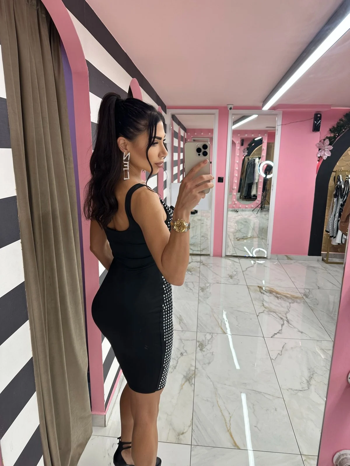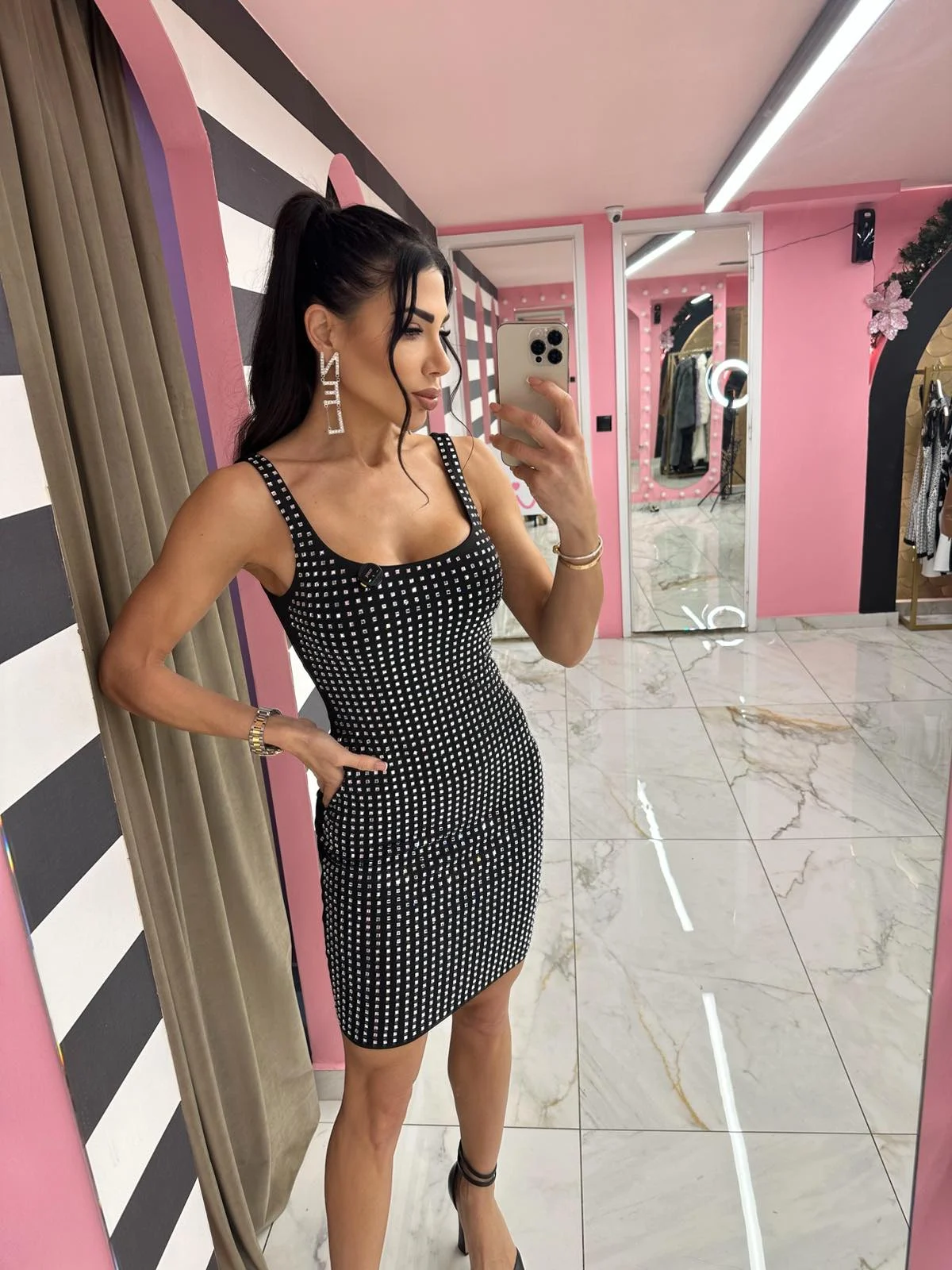 Μαύρο midi φόρεμα με all-over τετράγωνα strass που δίνουν εκρηκτική λάμψη από κάθε γωνία. Με βαθύ θηλυκό ντεκολτέ, άνετη εφαρμογή και chic glam ύφος που το κάνει ιδανικό για βραδινές εμφανίσεις, events και parties.