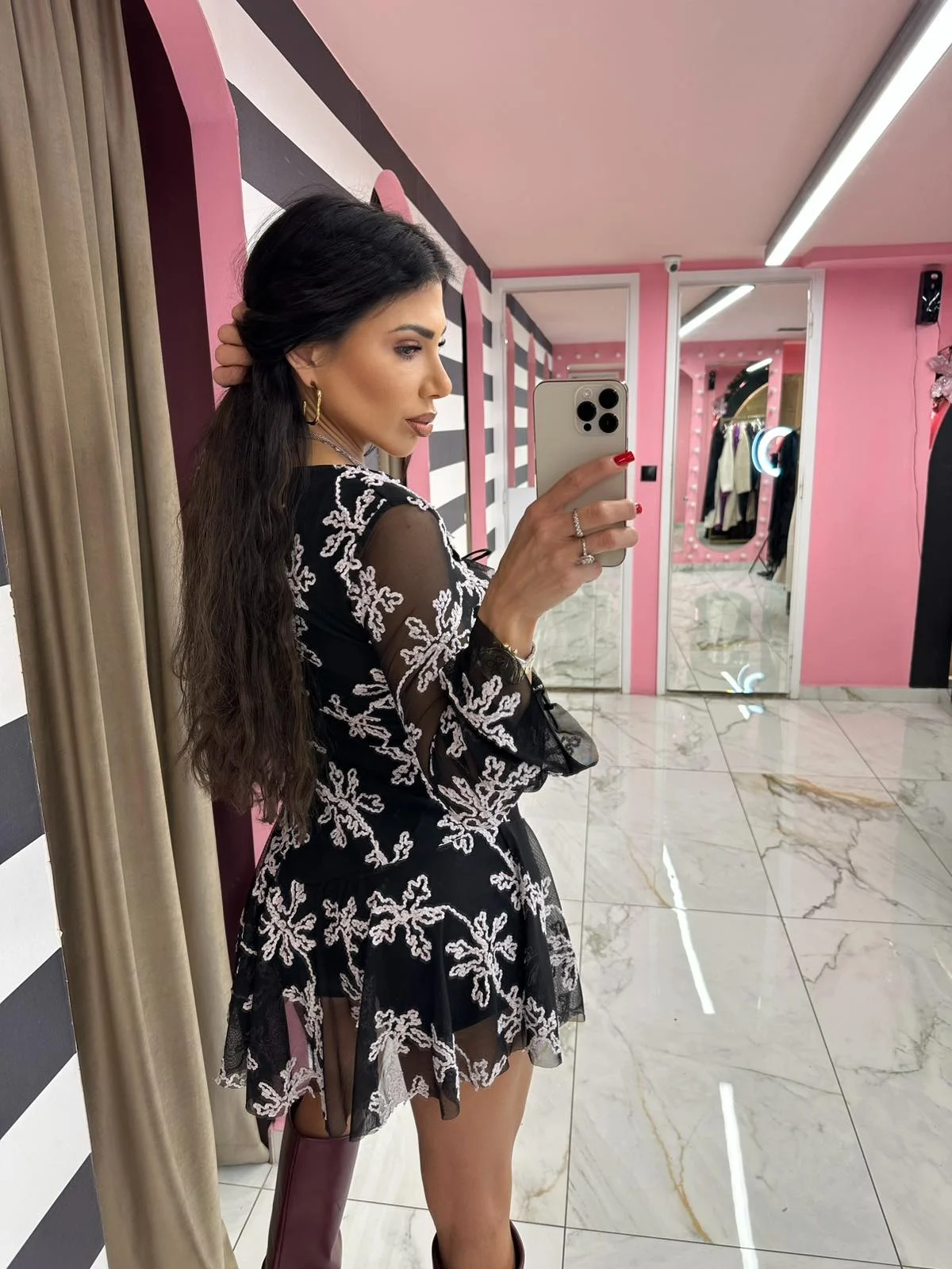 Mini φόρεμα σε μαύρη βάση με λευκή δαντέλα για έντονη αντίθεση και μοναδικό στυλ. Θηλυκή γραμμή, ντεκολτέ με δέσιμο και αέρινη κίνηση που ξεχωρίζει.