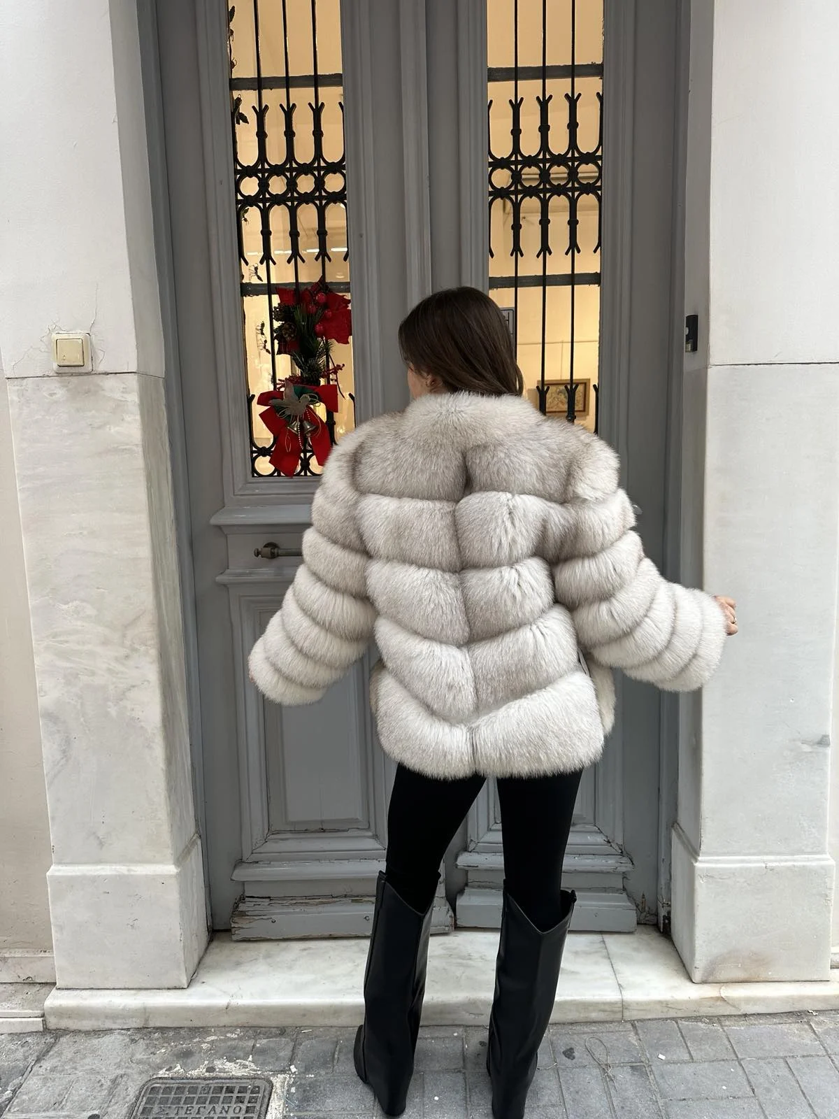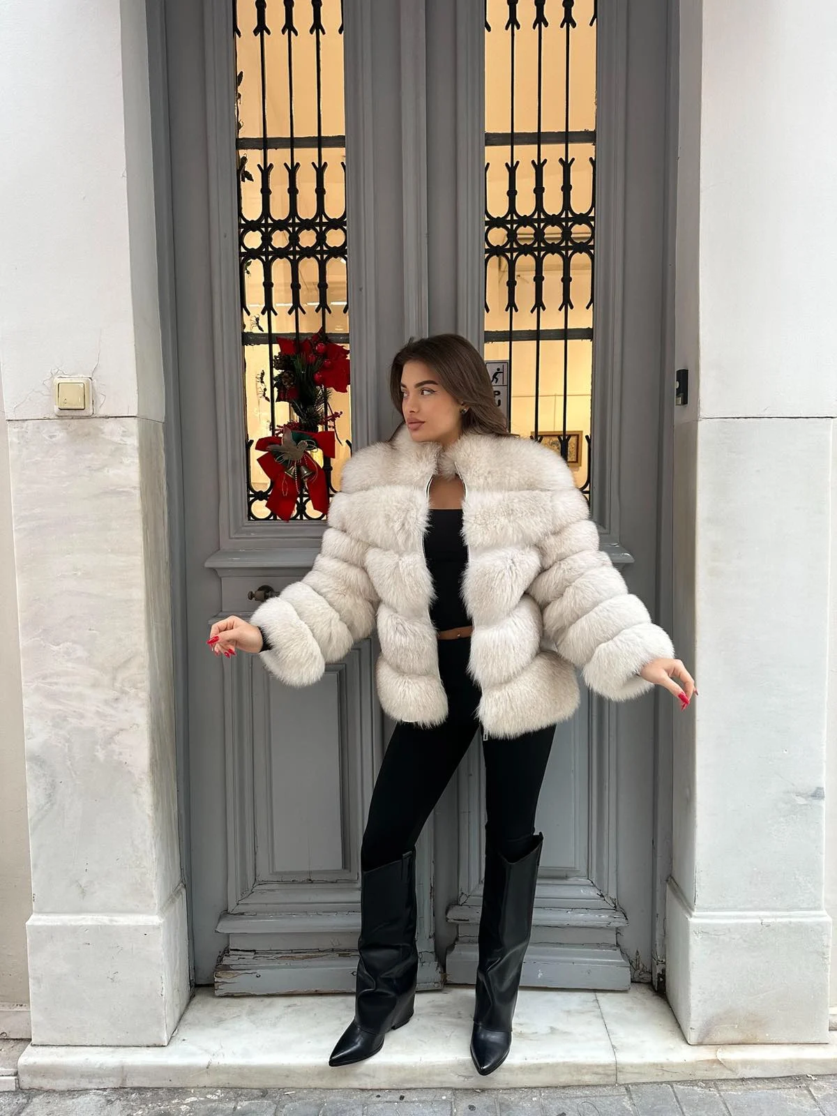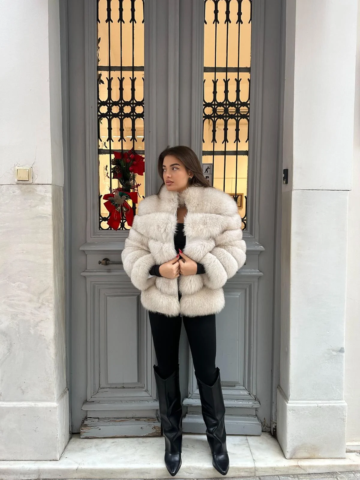 Εντυπωσιακή αληθινή γούνα αλεπούς σε εκλεπτυσμένη ivory απόχρωση, με πλούσιο όγκο και άψογη κατασκευή σε οριζόντιες φάσες. Η φυσική λάμψη της γούνας και η άνετη, κομψή γραμμή δημιουργούν ένα statement κομμάτι υψηλής αισθητικής. Ιδανική για γυναίκες που αναζητούν διαχρονική πολυτέλεια και ξεχωριστές εμφανίσεις.
