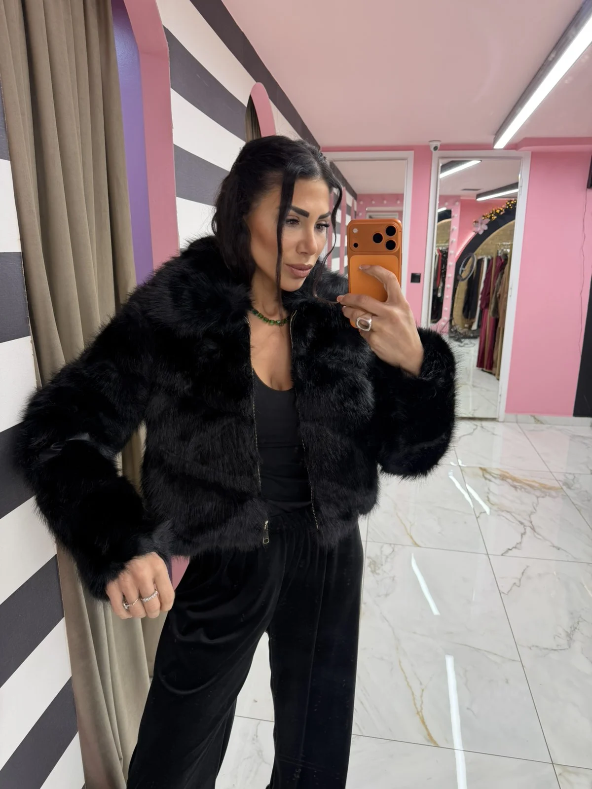 Κοντή οικολογική γούνα σε μαύρο χρώμα με πλούσια υφή. Διαχρονικό και εντυπωσιακό κομμάτι που ολοκληρώνει κάθε βραδινή αλλά και chic καθημερινή εμφάνιση.
