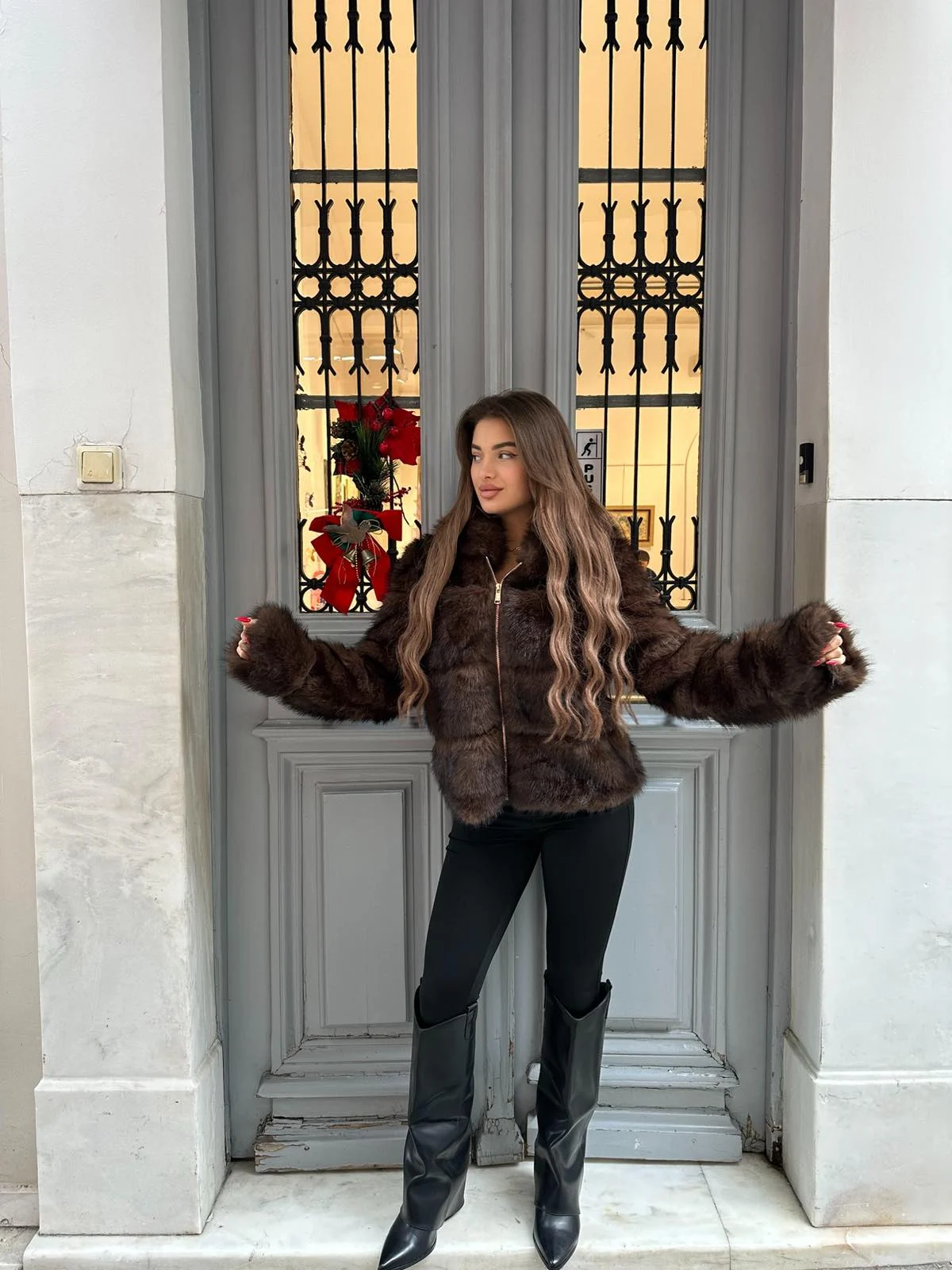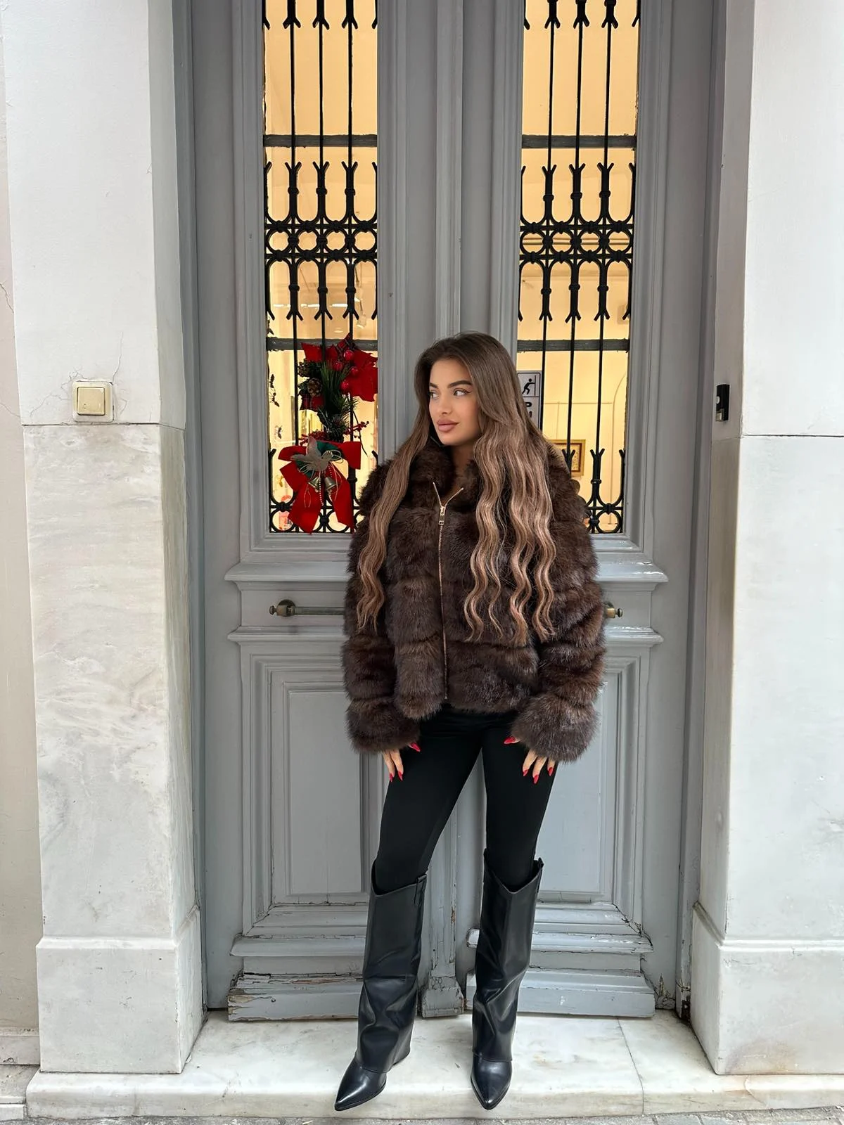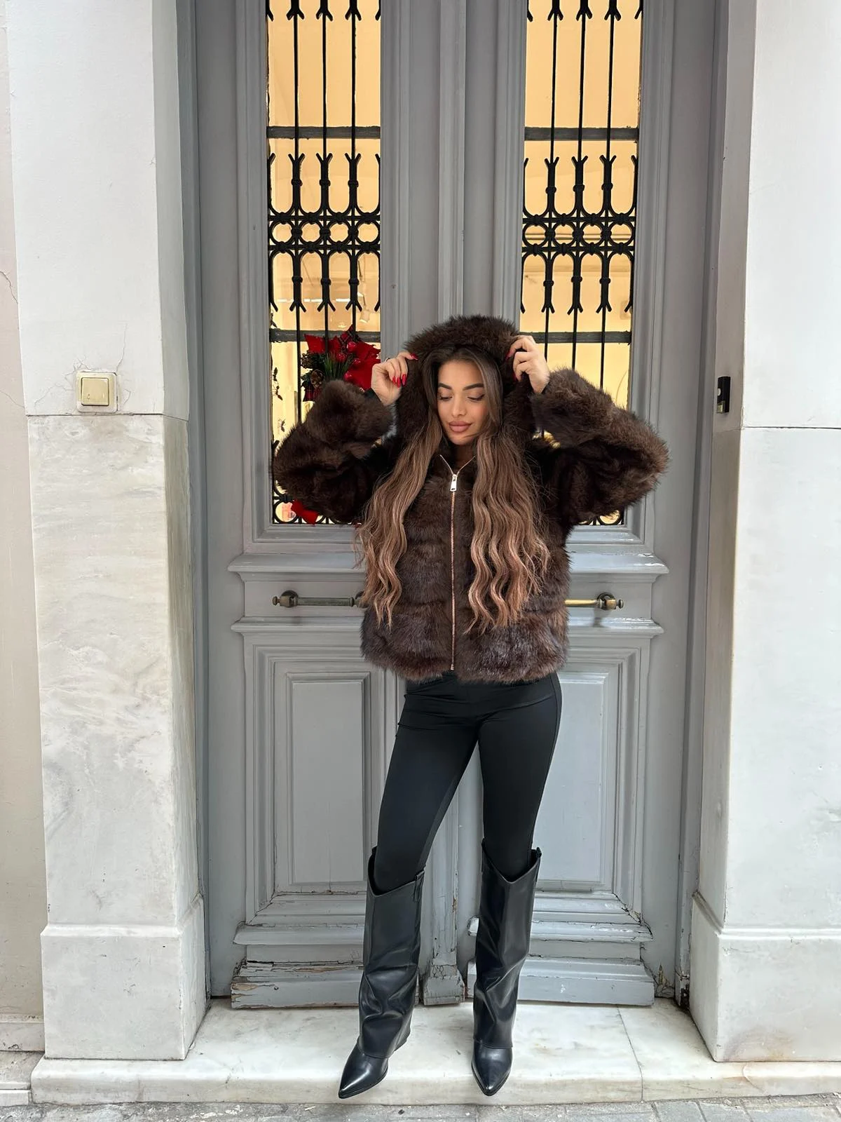 Κοντή οικολογική γούνα σε βαθιά σοκολατί απόχρωση, με κουκούλα και κλείσιμο με φερμουάρ για extra άνεση και προστασία από το κρύο. Πλούσια και απαλή υφή που χαρίζει πολυτελές αποτέλεσμα, ενώ η relaxed γραμμή την καθιστά ιδανική για καθημερινά αλλά και πιο statement city looks. Συνδυάζεται εύκολα με total black σύνολα και μπότες.