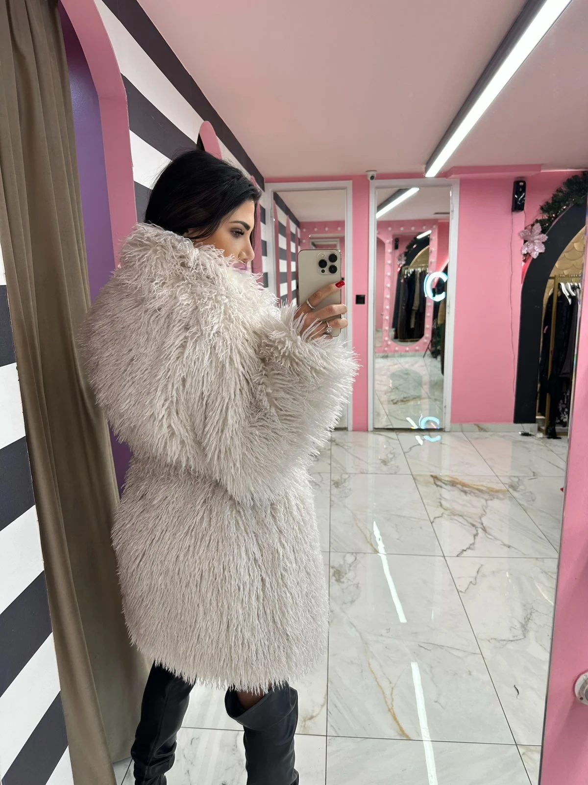 Εντυπωσιακή οικολογική γούνα σε ivory απόχρωση με έντονη, αφράτη υφή που αποπνέει πολυτέλεια. Φωτίζει το σύνολο και δίνει elegant χαρακτήρα, αποτελώντας must-have κομμάτι για ξεχωριστές χειμερινές εμφανίσεις.