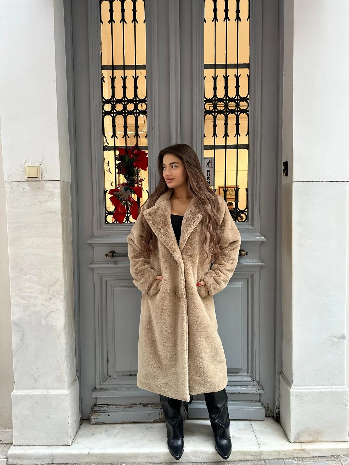 Μακριά οικολογική γούνα σε ζεστή σκούρα μπεζ απόχρωση, που αποπνέει πολυτέλεια και minimal αισθητική. Άνετη εφαρμογή και μαλακή υφή για all day εμφανίσεις με classy χαρακτήρα.