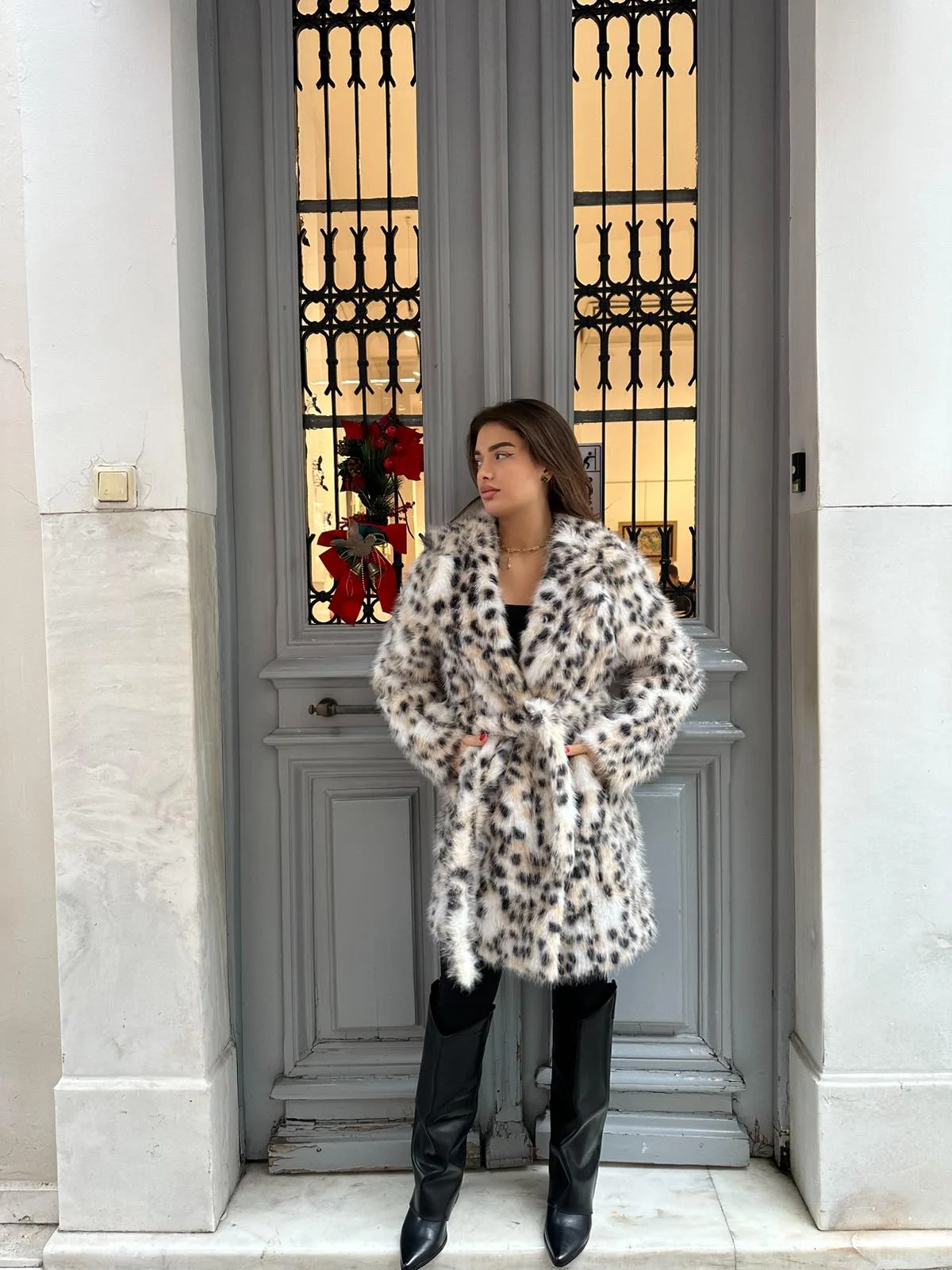 Εντυπωσιακή οικολογική γούνα σε λεοπάρ μοτίβο που αποπνέει δυναμισμό και θηλυκότητα. Μαλακή και πλούσια υφή, άνετη εφαρμογή και κομψή γραμμή που αγκαλιάζει το σώμα. Ιδανική για statement εμφανίσεις που ξεχωρίζουν, από πρωινά city looks μέχρι βραδινές εξόδους.