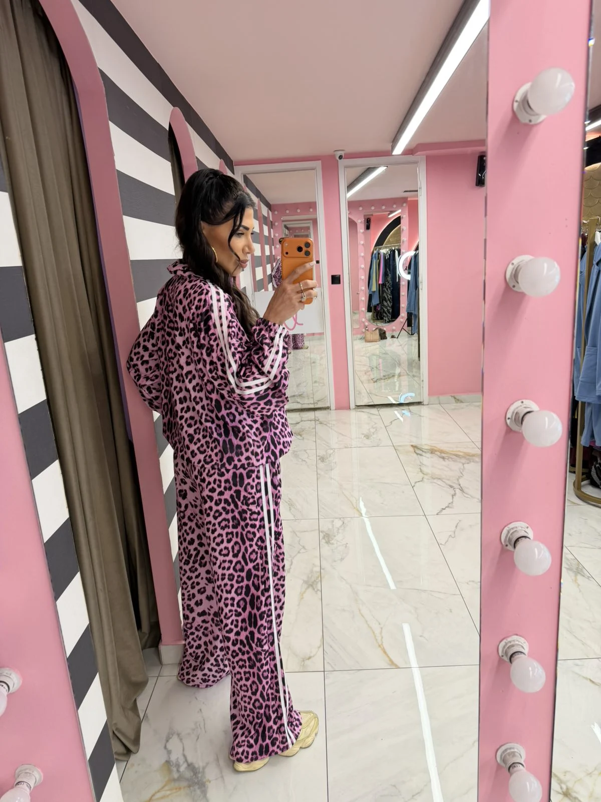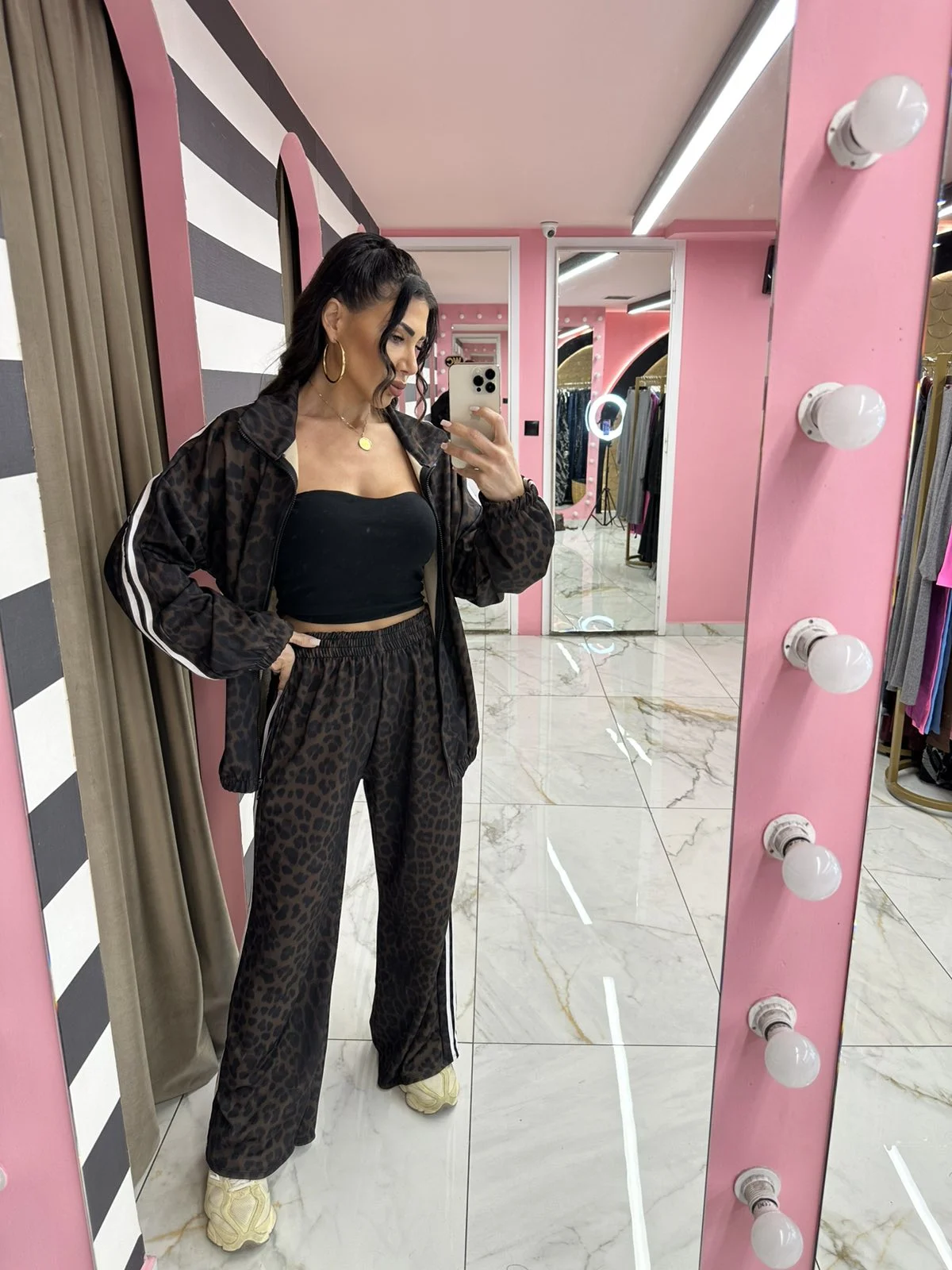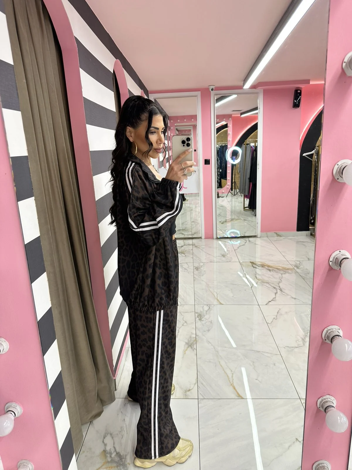 Εντυπωσιακό καθημερινό σετ φόρμας με animal print που ξεχωρίζει. Αποτελείται από ζακέτα με φερμουάρ και διακοσμητικές ρίγες στα μανίκια, καθώς και παντελόνι με λάστιχο στη μέση και άνετη, ίσια γραμμή. Μαλακό ύφασμα με ωραία πτώση, ιδανικό για all-day εμφανίσεις με fashion χαρακτήρα.