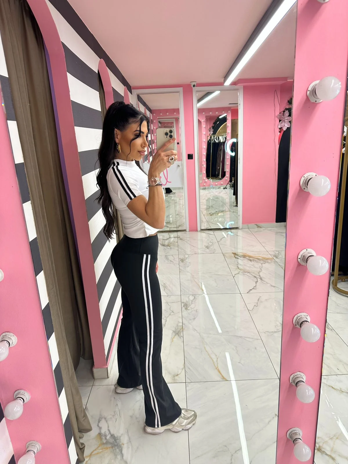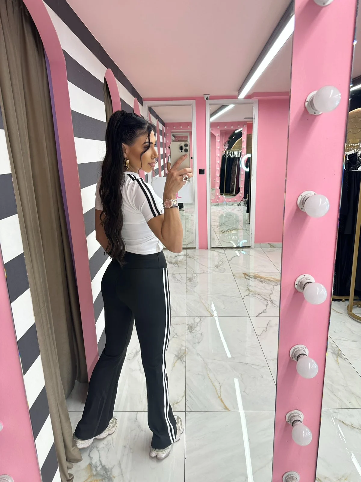 Αθλητικό σετ με κοντομάνικο crop top και ψηλόμεσο παντελόνι σε flare γραμμή. Ελαστικό, άνετο και super κολακευτικό, αγκαλιάζει το σώμα και προσφέρει ελευθερία κινήσεων. Ιδανικό για sporty αλλά και casual εμφανίσεις.
