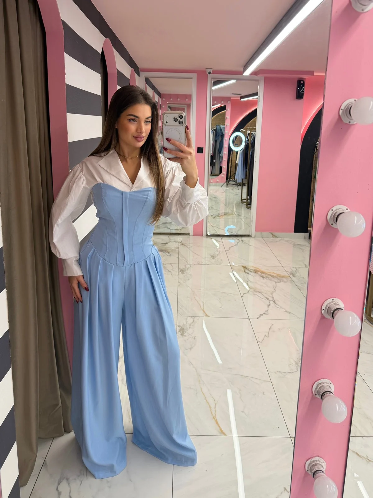 Μια σικ, διαχρονική ολόσωμη φόρμα σε μαύρο χρώμα με ενσωματωμένο κορσέ και λευκό πουκάμισο για άψογη εφαρμογή. Ιδανική για εμφανίσεις στο γραφείο αλλά και βραδινές εξόδους, συνδυάζοντας κομψότητα και άνεση.