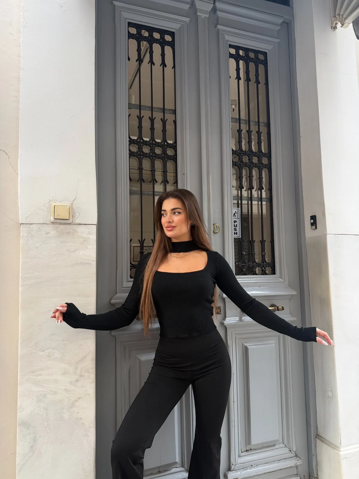 Κομψή και διαχρονική μπλούζα σε μαύρο χρώμα με ιδιαίτερο άνοιγμα στο στήθος και choker neckline. Εφαρμοστή γραμμή που αναδεικνύει το σώμα, ελαστικό ύφασμα για άνεση και στυλ από το πρωί μέχρι το βράδυ.