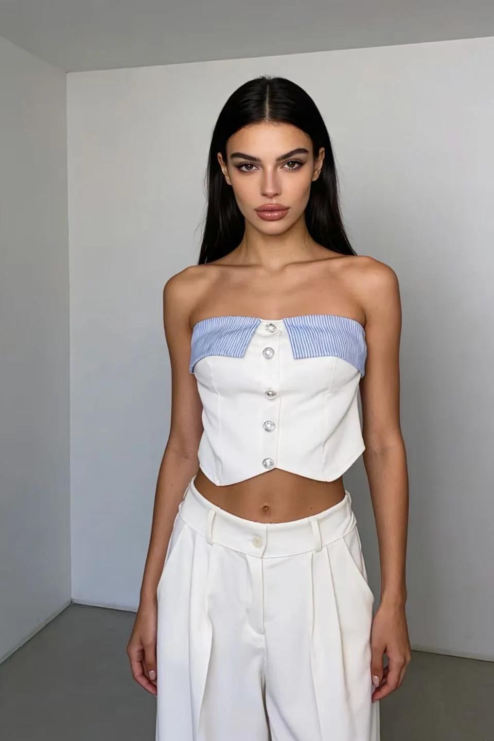 Strapless top με κουμπιά και ιδιαίτερη λεπτομέρεια στο τελείωμα, συνδυασμένο με ψηλόμεσο παντελόνι σε άνετη γραμμή για τέλεια εφαρμογή 💫