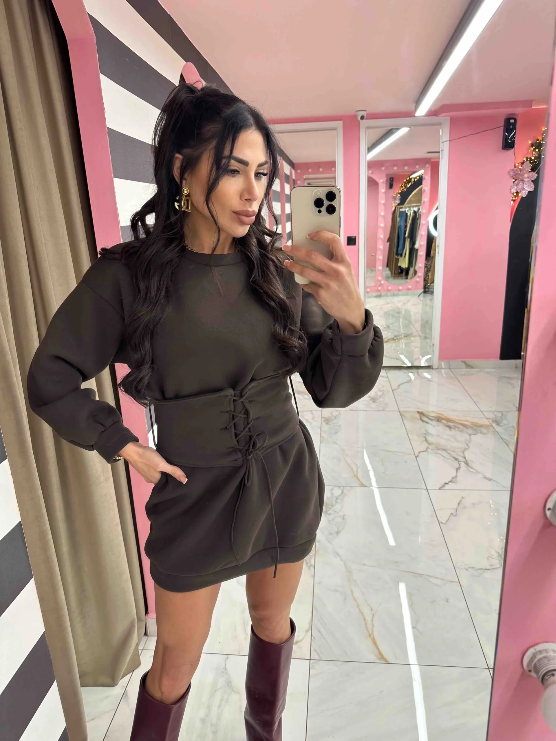 Mini μπλουζοφόρεμα σε βαθύ καφέ χρώμα με εντυπωσιακή δετή μέση τύπου κορσέ που σχηματίζει τη σιλουέτα. Άνετο, μαλακό και ζεστό ύφασμα, τέλειο για all-day εμφανίσεις. Συνδυάζεται άψογα με μπότες και χοντρές κάλτσες.
