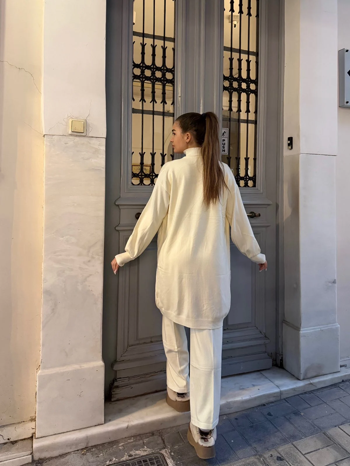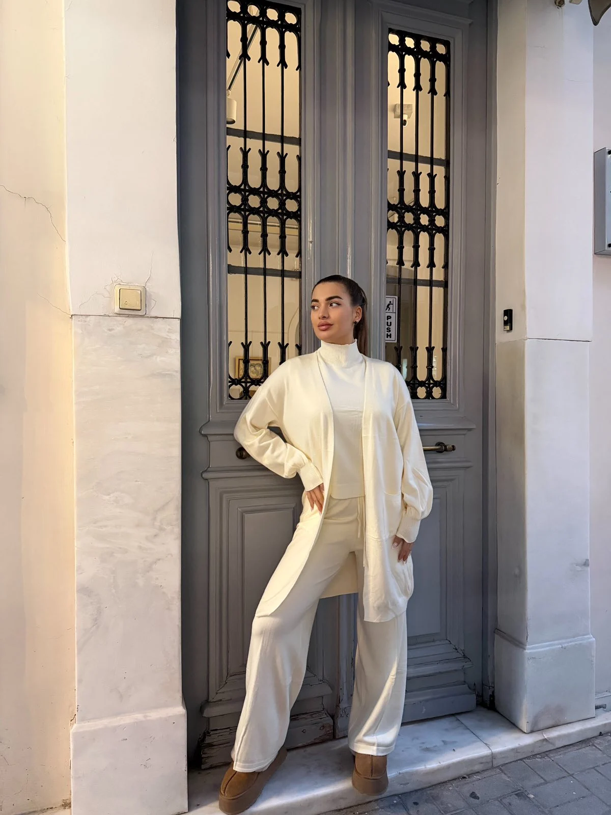Minimal & chic σετ τριών τεμαχίων που αποπνέει καθαρότητα και κομψότητα. Αποτελείται από άνετο παντελόνι, basic top με όρθιο γιακά και αέρινη ζακέτα για effortless καθημερινά looks από το πρωί μέχρι το βράδυ.