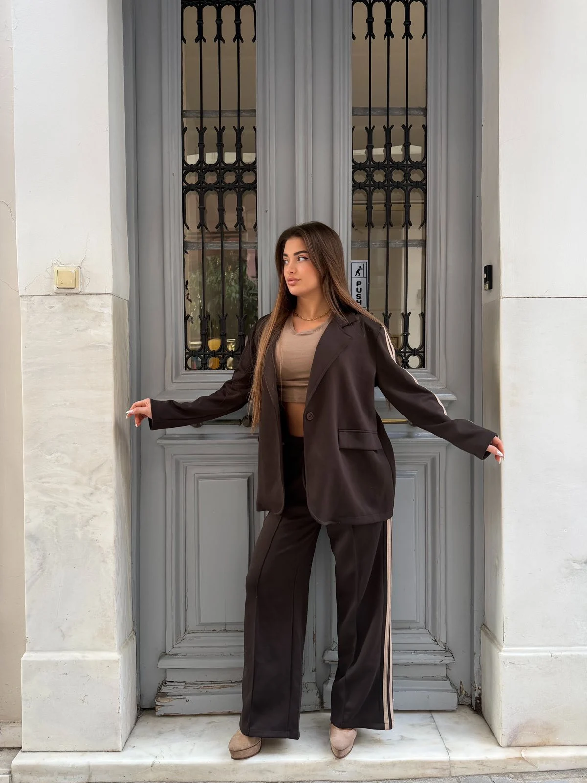 Minimal αλλά δυναμικό σετ σε σκούρα chocolate απόχρωση, που συνδυάζει άνεση και σύγχρονο urban στυλ. Το σακάκι χαρίζει δομημένη γραμμή, ενώ το παντελόνι με λάστιχο και κορδόνι προσφέρει άνεση όλη μέρα. Ένα all-day σύνολο που προσαρμόζεται εύκολα σε casual ή πιο chic looks.