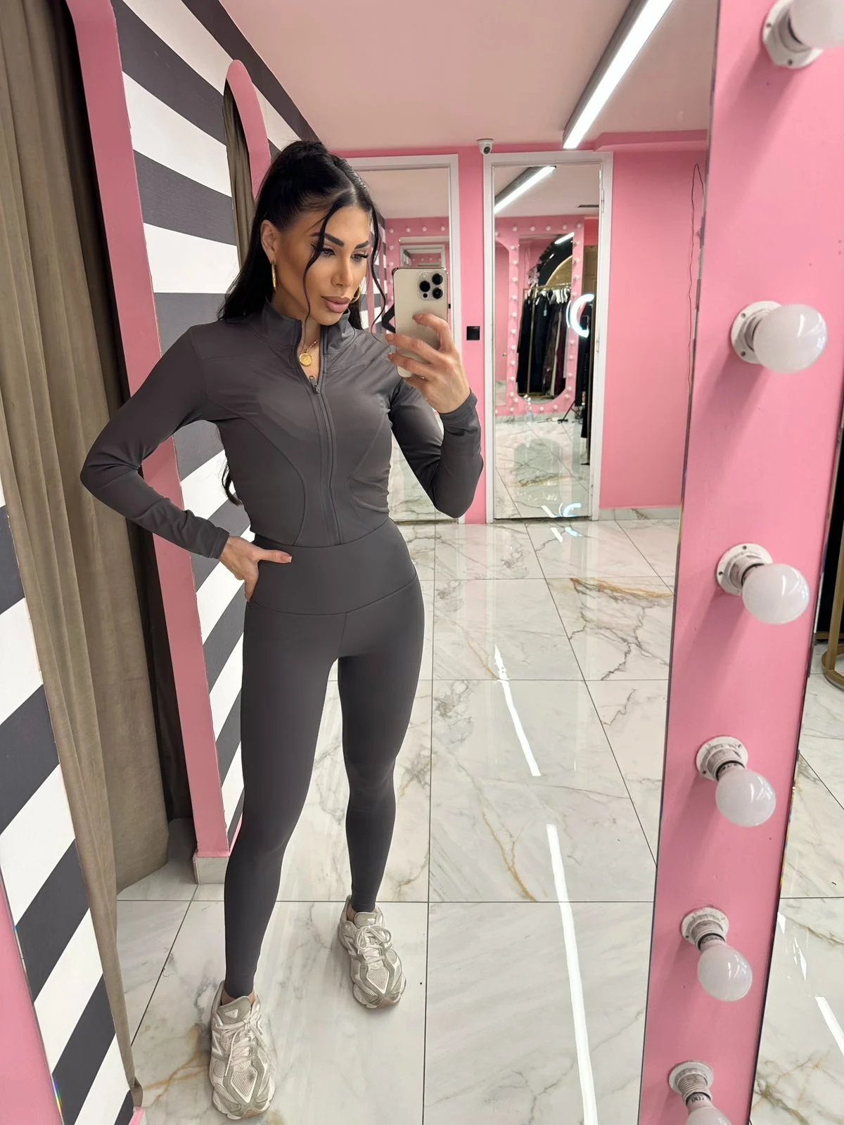 Αθλητικό σετ σε σκούρο γκρι χρώμα με minimal αισθητική. Τέλειο για όσες αγαπούν το clean & δυναμικό look, φοριέται άνετα από προπόνηση μέχρι casual εξόδους.