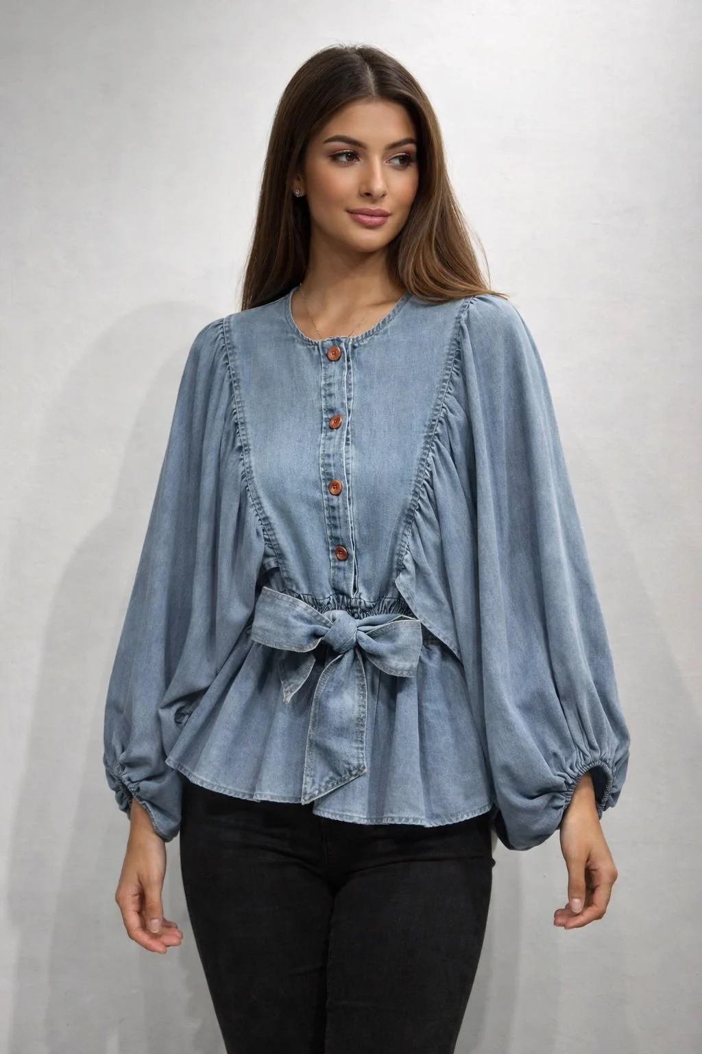 Ρομαντική denim μπλούζα με ιδιαίτερο design και έντονες λεπτομέρειες. Διαθέτει κουμπιά στο μπροστινό μέρος, εντυπωσιακά balloon μανίκια και λάστιχο στη μέση με ζώνη για τέλεια εφαρμογή που αναδεικνύει τη σιλουέτα. Ιδανική επιλογή για chic & girly εμφανίσεις από το πρωί μέχρι το βράδυ.