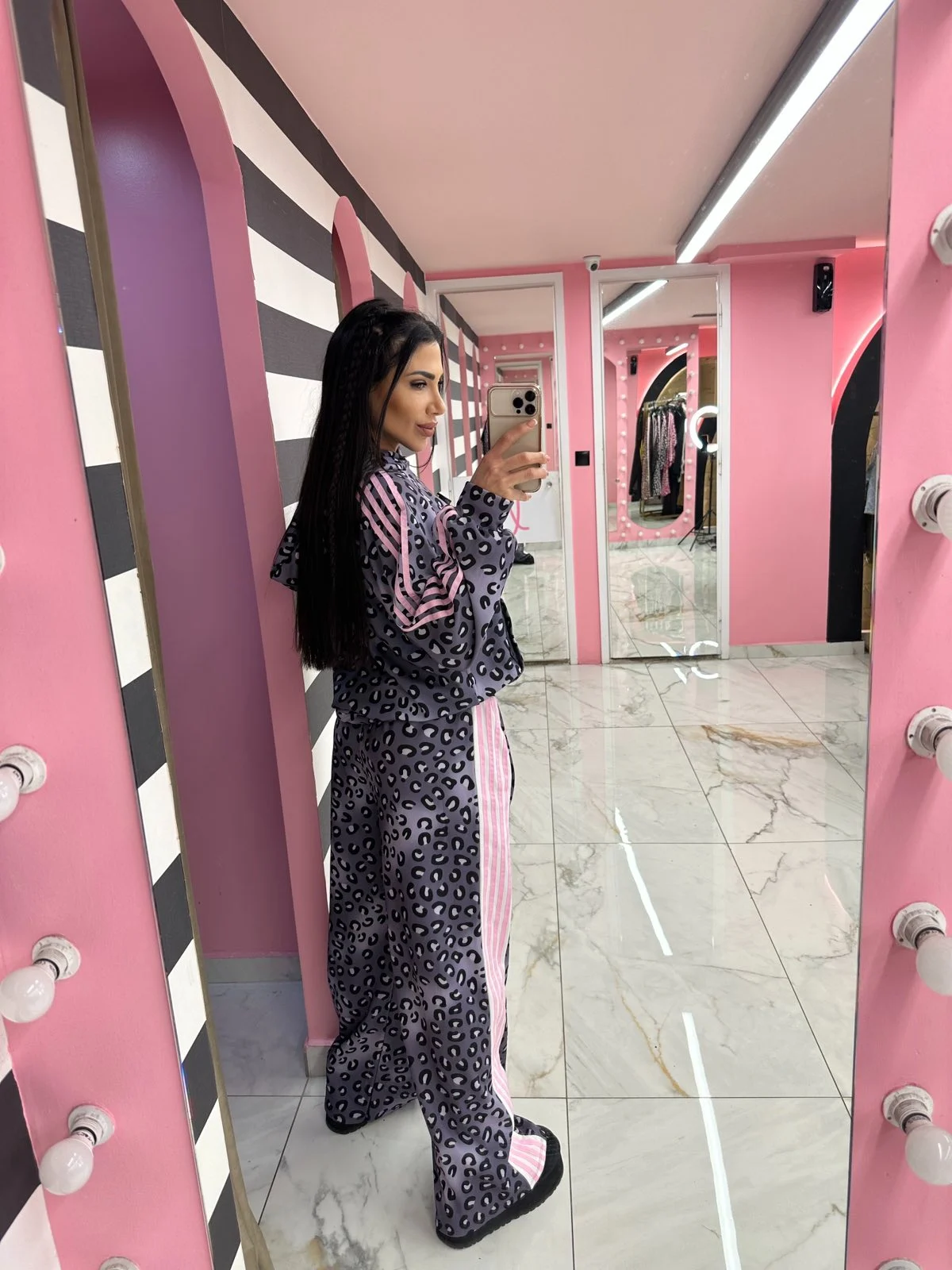 Γκρι leopard με ροζ ρίγες που φωτίζουν το σύνολο. Ανάλαφρο, άνετο και ιδανικό για όλη μέρα.