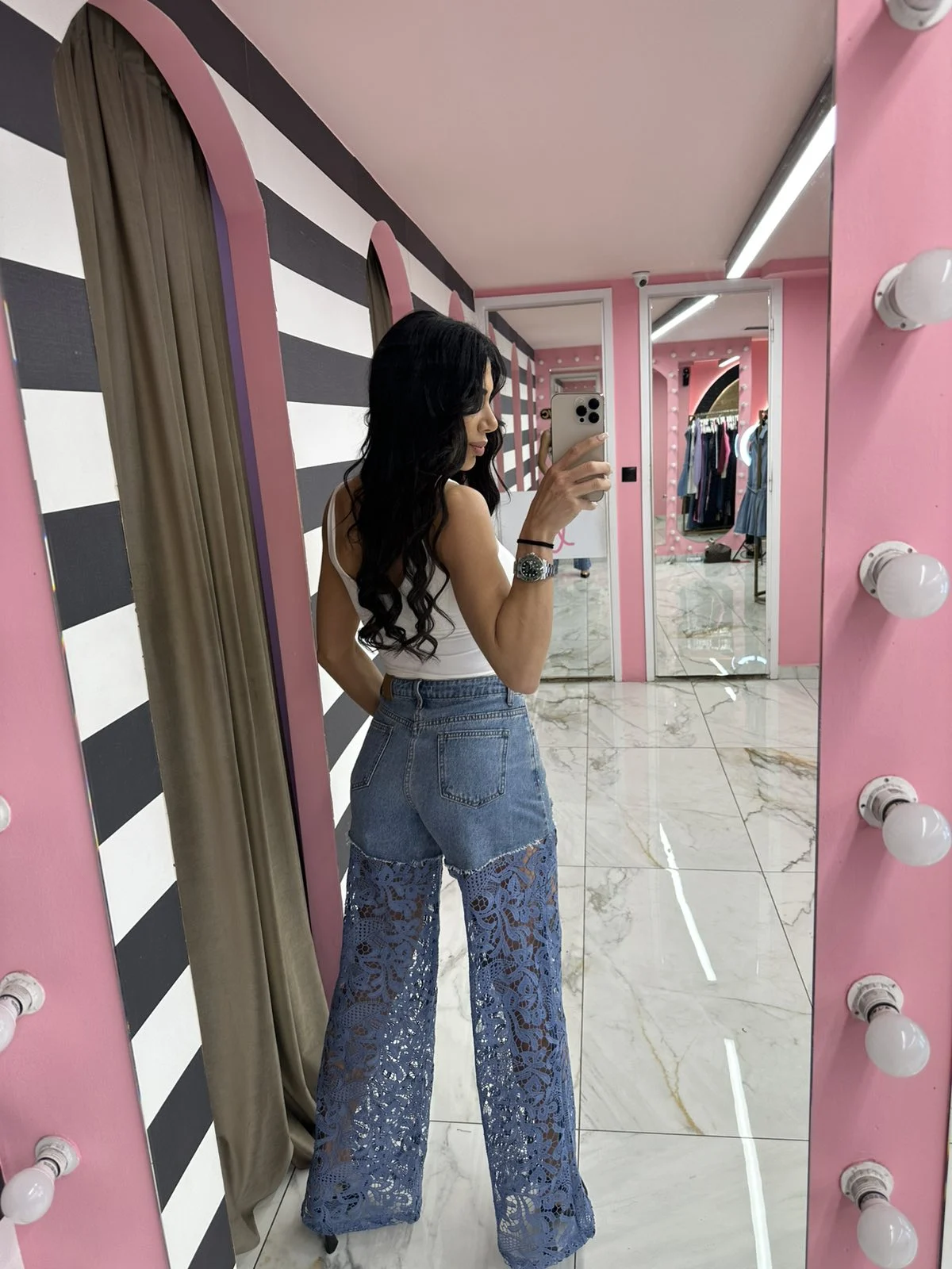 Ξεχωριστό τζιν παντελόνι που συνδυάζει denim με εντυπωσιακή δαντέλα στο κάτω μέρος, δημιουργώντας ένα μοναδικό και ultra θηλυκό αποτέλεσμα. Ψηλόμεσο, αγκαλιάζει τη μέση και ανοίγει σε φαρδιά γραμμή προς τα κάτω, χαρίζοντας ύψος και κομψή σιλουέτα. Οι λαμπερές λεπτομέρειες στο επάνω μέρος δίνουν glam πινελιά, κάνοντάς το ιδανικό για εμφανίσεις που θέλεις να ξεχωρίσεις.