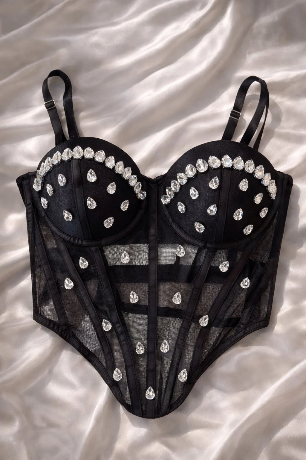 Εντυπωσιακός μαύρος κορσές με διαφάνεια και λαμπερές πέτρες που τραβάνε όλα τα βλέμματα ✨ Διαθέτει ενίσχυση στο στήθος για τέλεια εφαρμογή και σταθερότητα, ενώ οι λεπτομέρειες με στρας δίνουν extra glam αποτέλεσμα. Αναδεικνύει τη μέση και δημιουργεί super sexy silhouette – ιδανικό για βραδινές εμφανίσεις και statement outfits.