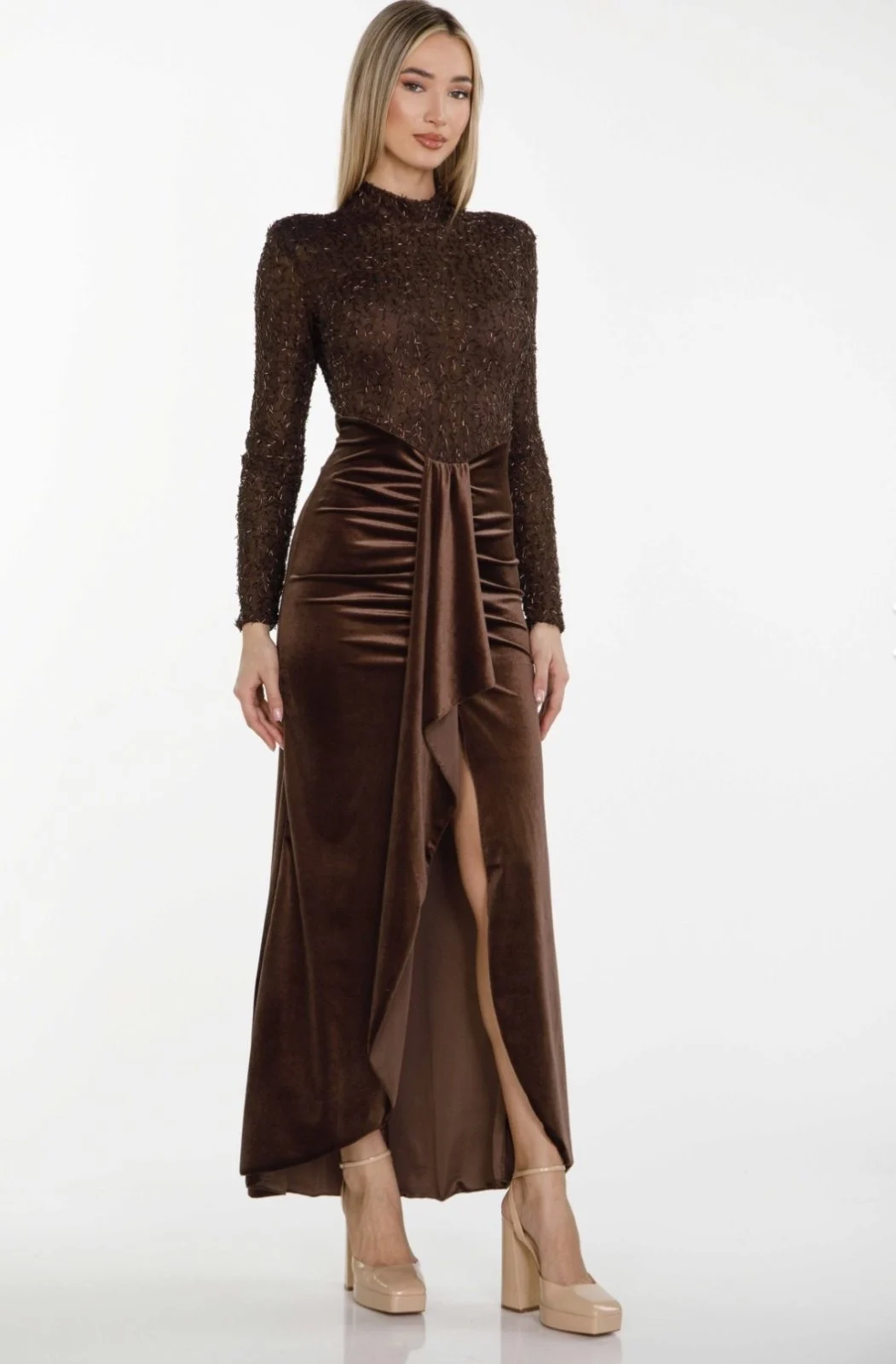 Sophisticated maxi φόρεμα σε σοκολατί καφέ απόχρωση. Ο συνδυασμός διαφάνειας με glitter και βελούδινης φούστας χαρίζει πολυτελές αποτέλεσμα, ενώ η σούρα και το άνοιγμα τονίζουν τη θηλυκότητα.