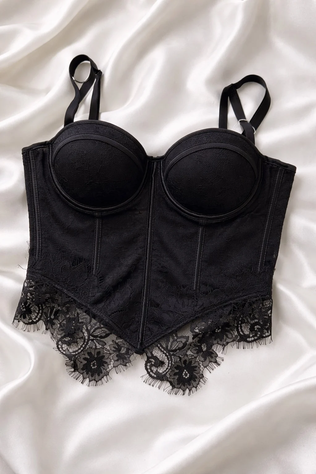 Κομψός μαύρος κορσές με δαντέλα και ενίσχυση στο στήθος που προσφέρει τέλεια εφαρμογή και στήριξη. Αγκαλιάζει το σώμα, τονίζει τη μέση και δημιουργεί sexy αλλά elegant αποτέλεσμα. Η δαντελένια λεπτομέρεια στο τελείωμα δίνει extra θηλυκότητα, ιδανικό για βραδινές εμφανίσεις αλλά και chic outfits με παντελόνι ή φούστα.