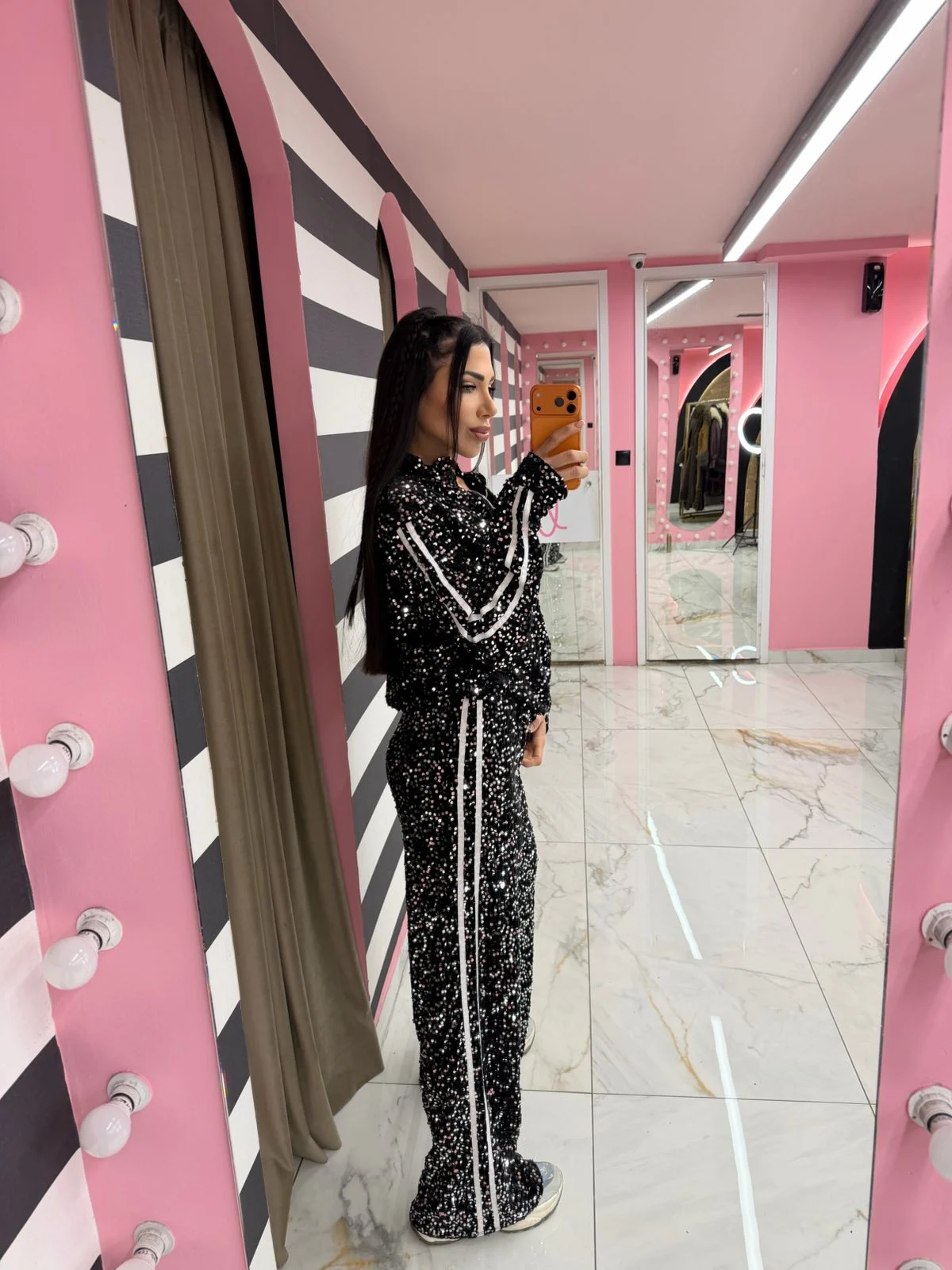 Το απόλυτο μαύρο glam κομμάτι. Παγιέτα παντού που δημιουργεί διακριτική λάμψη, άνετη γραμμή και αθλητική λεπτομέρεια στη ρίγα. Το πιο “σίγουρη επιτυχία” βραδινό σετ.