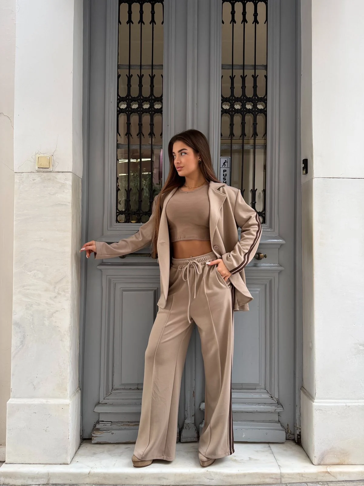 Στυλάτο σετ τριών κομματιών σε mocha απόχρωση, ιδανικό για καθημερινές αλλά και πιο προσεγμένες εμφανίσεις. Αποτελείται από σακάκι με μοντέρνες ρίγες στα μανίκια, crop top και παντελόνι με λάστιχο και κορδόνι στη μέση για άνετη εφαρμογή. Φοριέται μαζί ή ξεχωριστά και προσφέρει effortless chic αποτέλεσμα από το πρωί έως το βράδυ.
