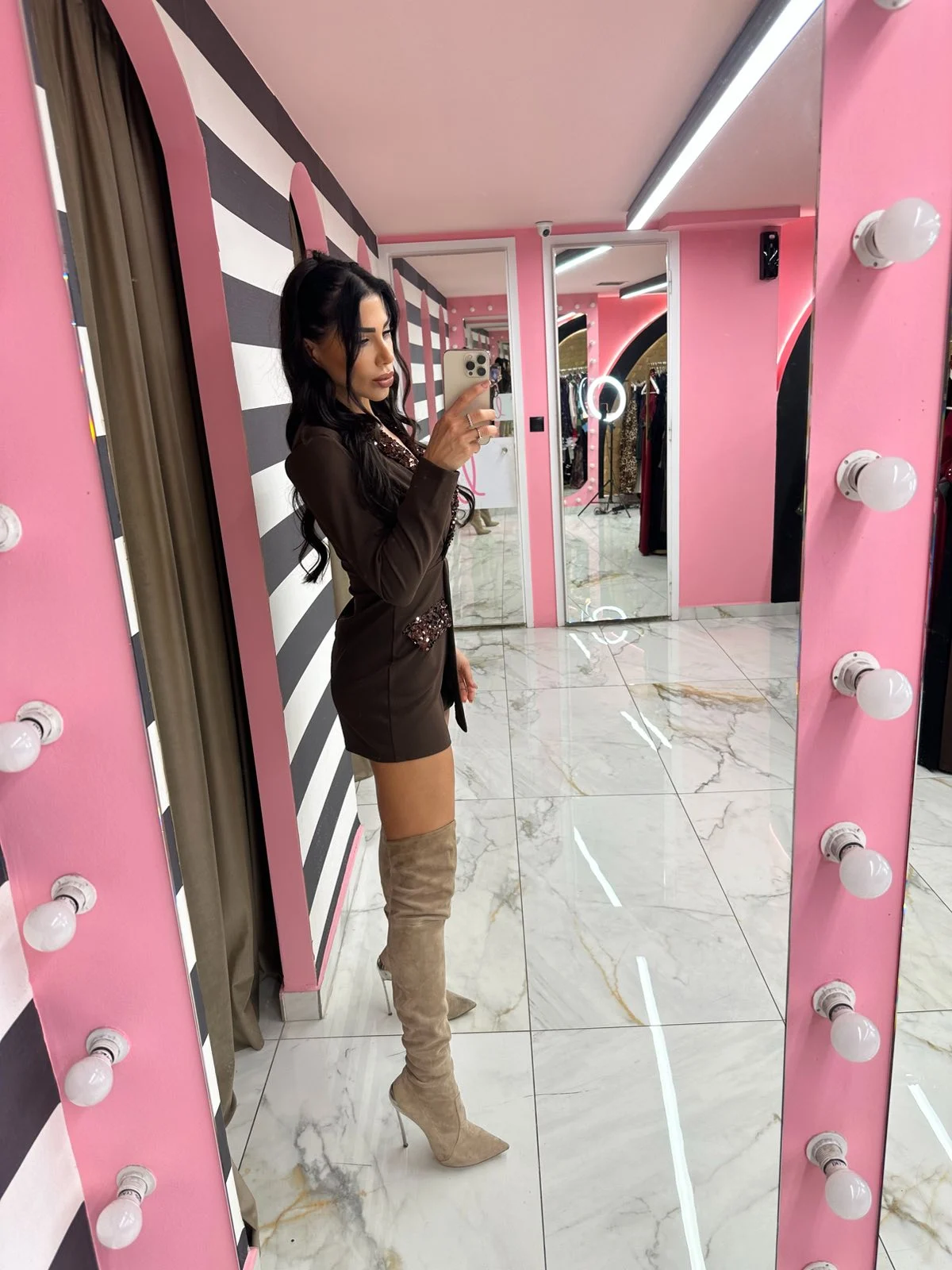 Η απόλυτη σοκολατί επιλογή για glam εμφανίσεις! Λαμπερές παγιέτες στο ντεκολτέ και στις τσέπες, structured γραμμή που αγκαλιάζει το σώμα και θηλυκό μήκος που κολακεύει τα πόδια. One size, με ελαστικότητα που καλύπτει άνετα έως large.