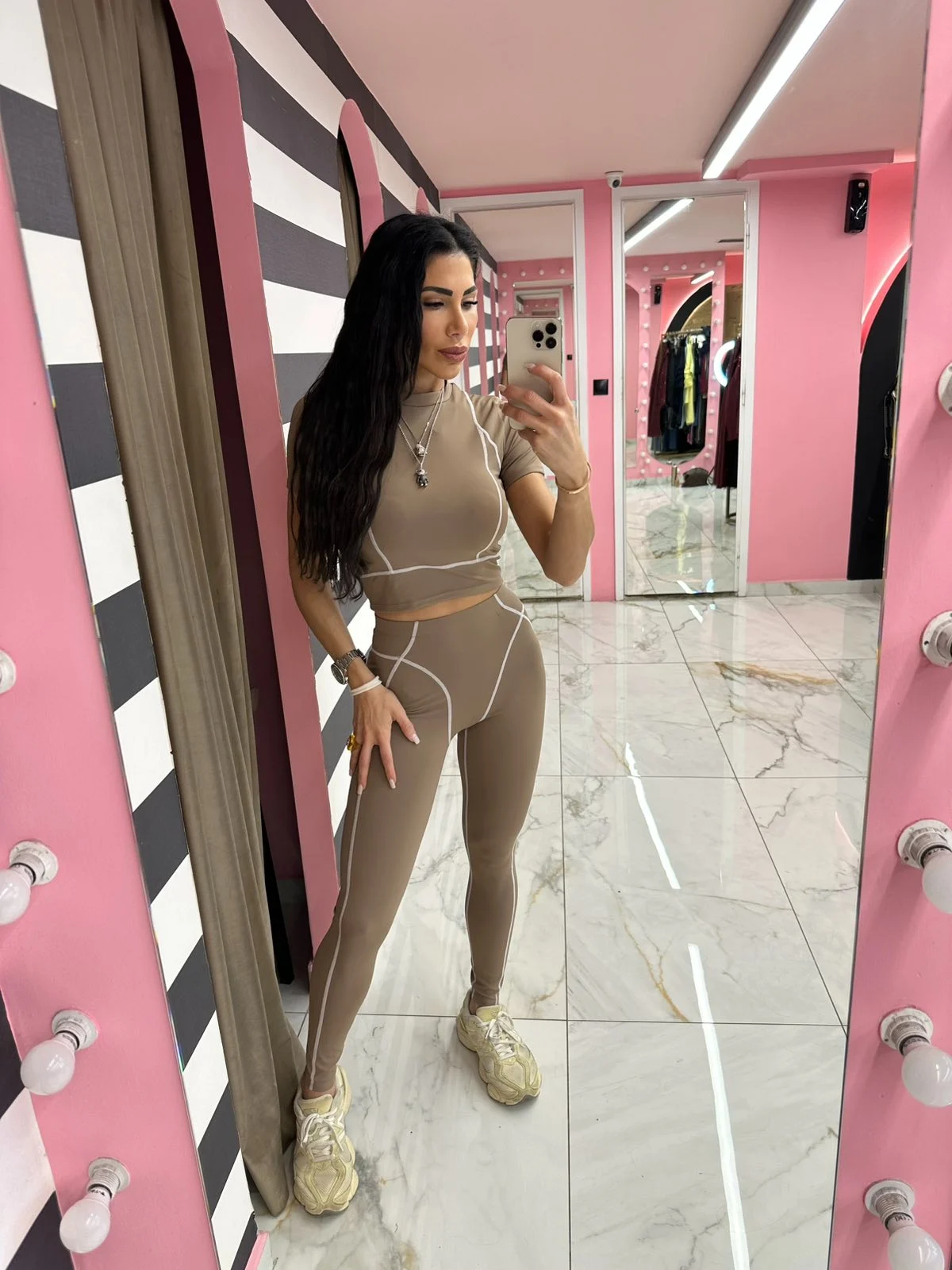 Θηλυκό και ουδέτερο σετ που συνδυάζει άνεση και στυλ. Το μπεζ tone δίνει soft πολυτελή αίσθηση, ενώ οι ραφές contour κάνουν το σώμα να δείχνει πιο γραμμωμένο. Τέλειο με sneakers και oversized jacket.