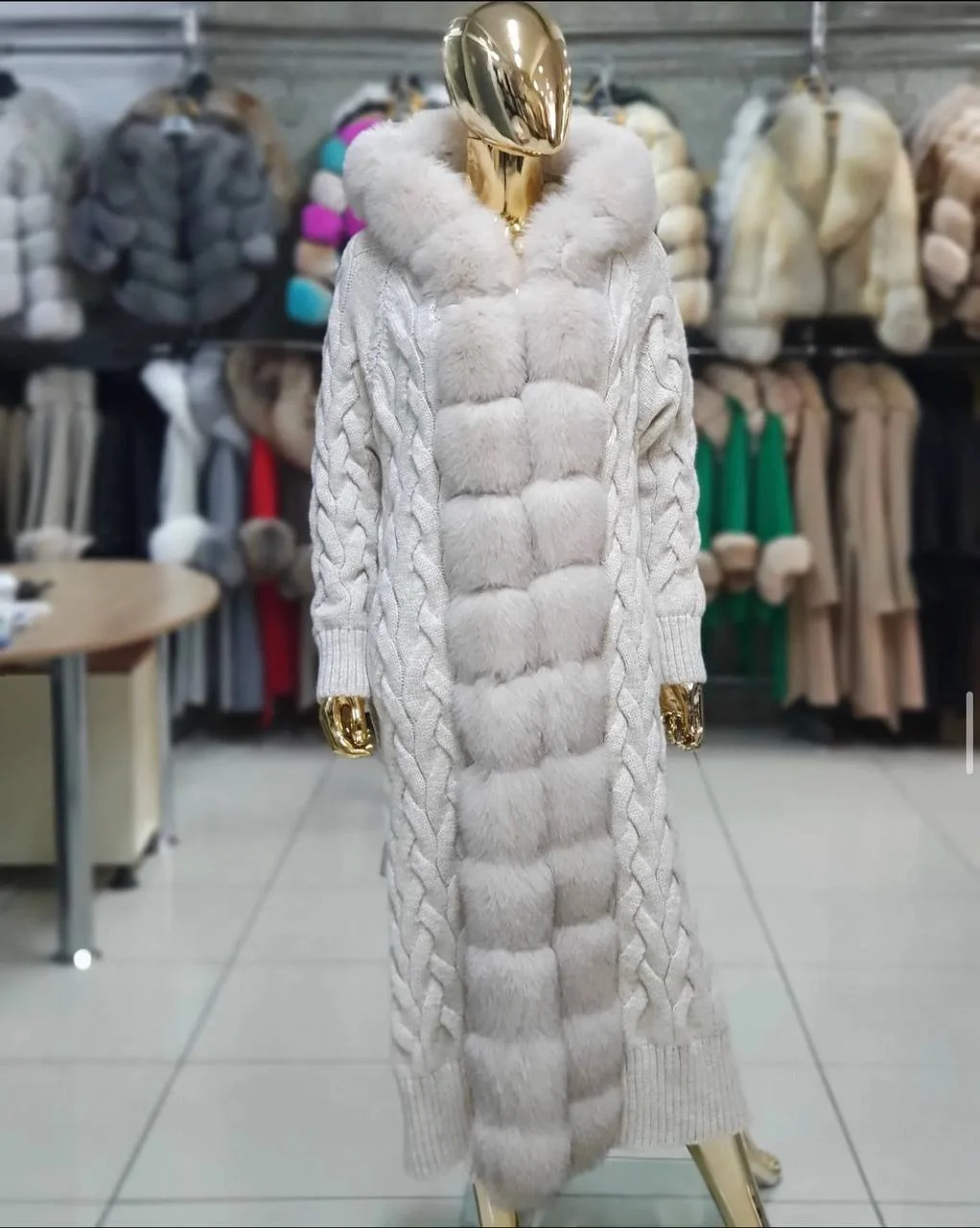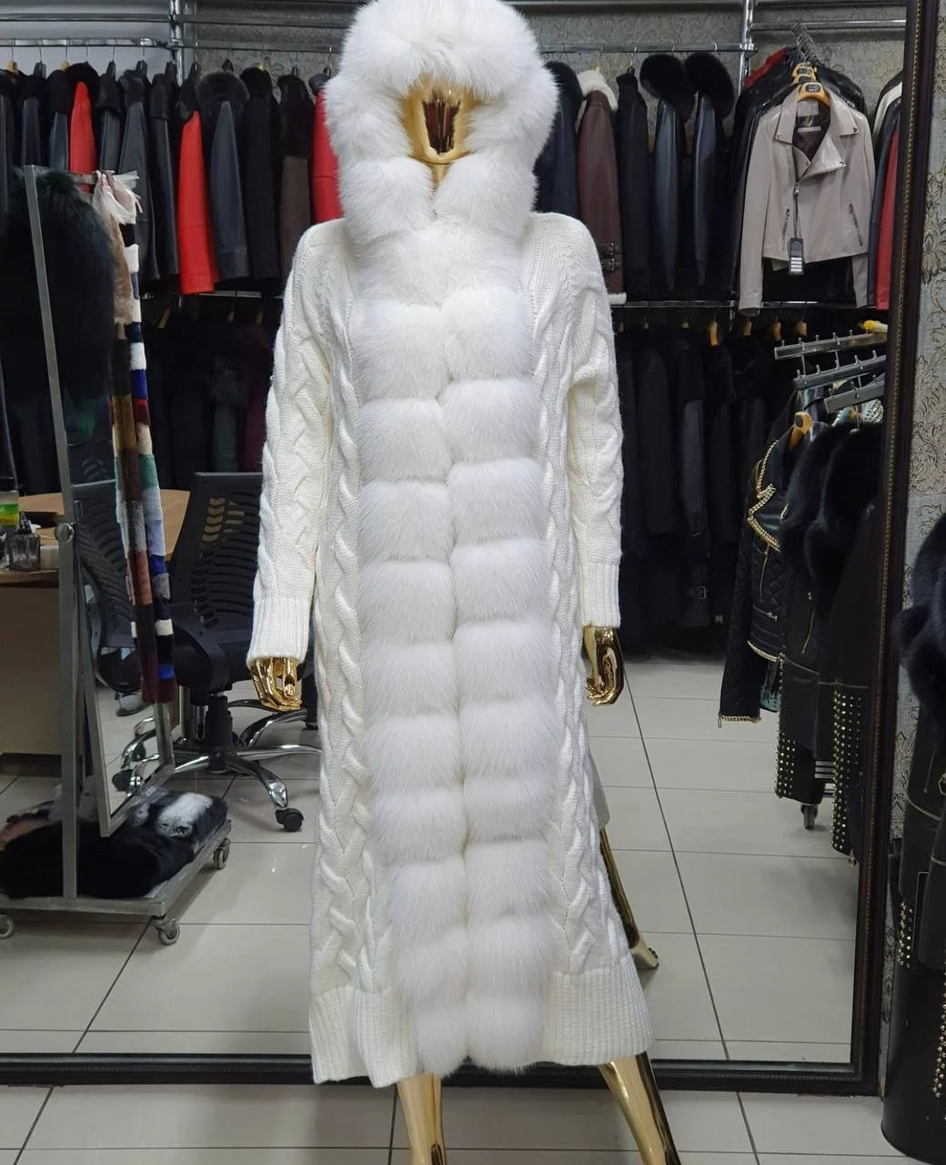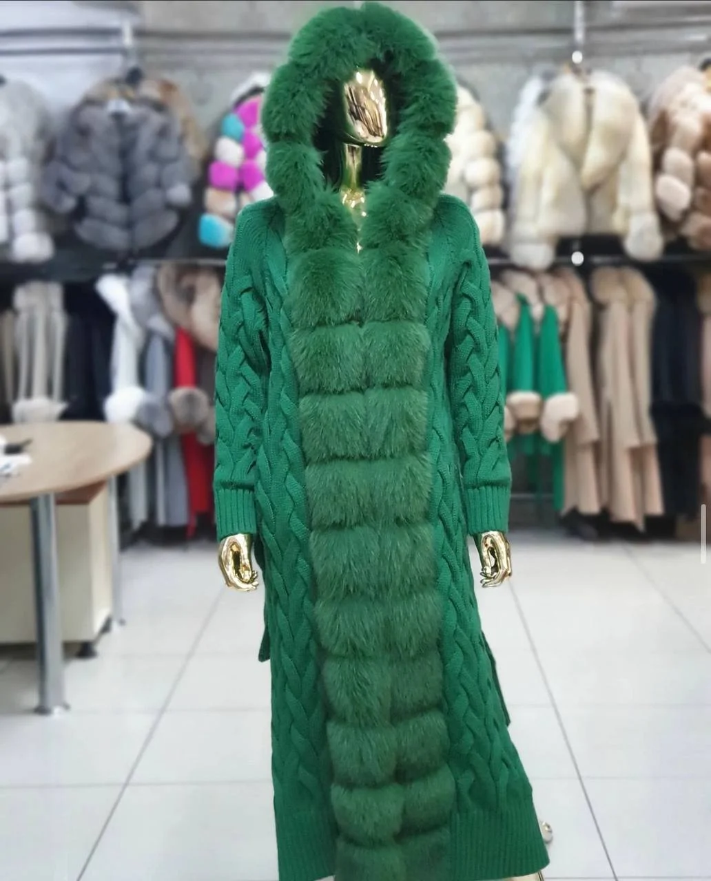 Απόλυτη χειμωνιάτικη πολυτέλεια! Μακριά πλεκτή ζακέτα με πανέμορφες φαρδιές πλεξούδες στα μανίκια και στο σώμα, συνδυασμένη με αυθεντική, αφράτη γούνα αλεπούς σε όλο το μπροστινό μέρος και στην κουκούλα.