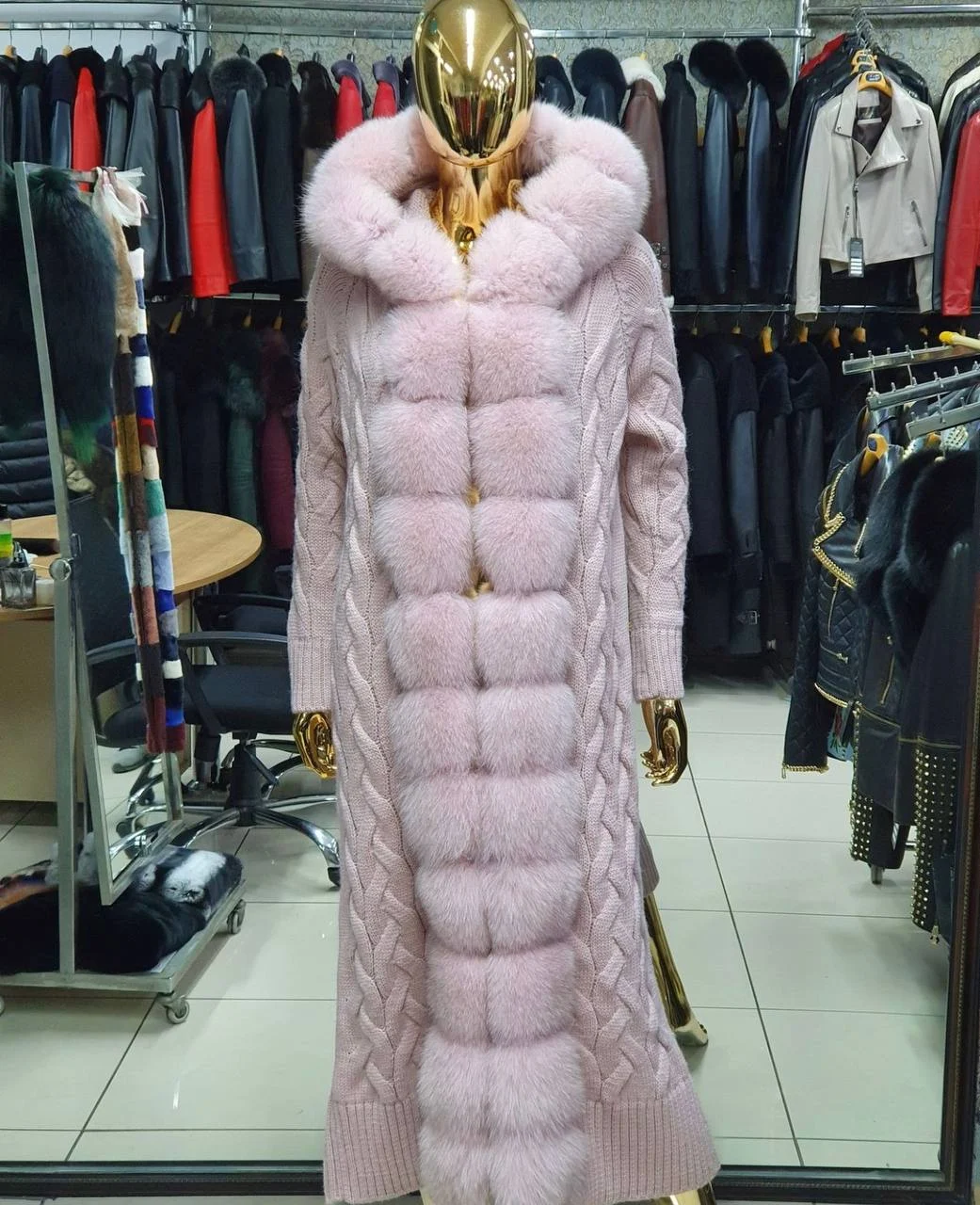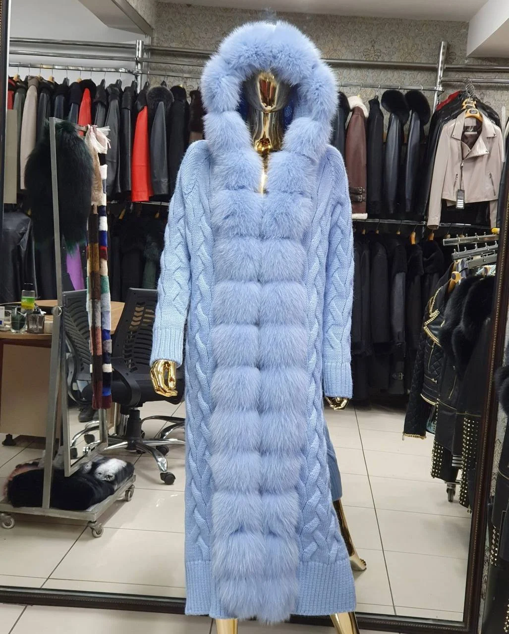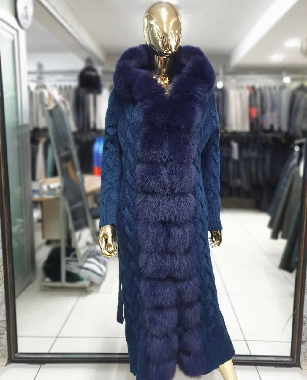 Απόλυτη χειμωνιάτικη πολυτέλεια! Μακριά πλεκτή ζακέτα με πανέμορφες φαρδιές πλεξούδες στα μανίκια και στο σώμα, συνδυασμένη με αυθεντική, αφράτη γούνα αλεπούς σε όλο το μπροστινό μέρος και στην κουκούλα.