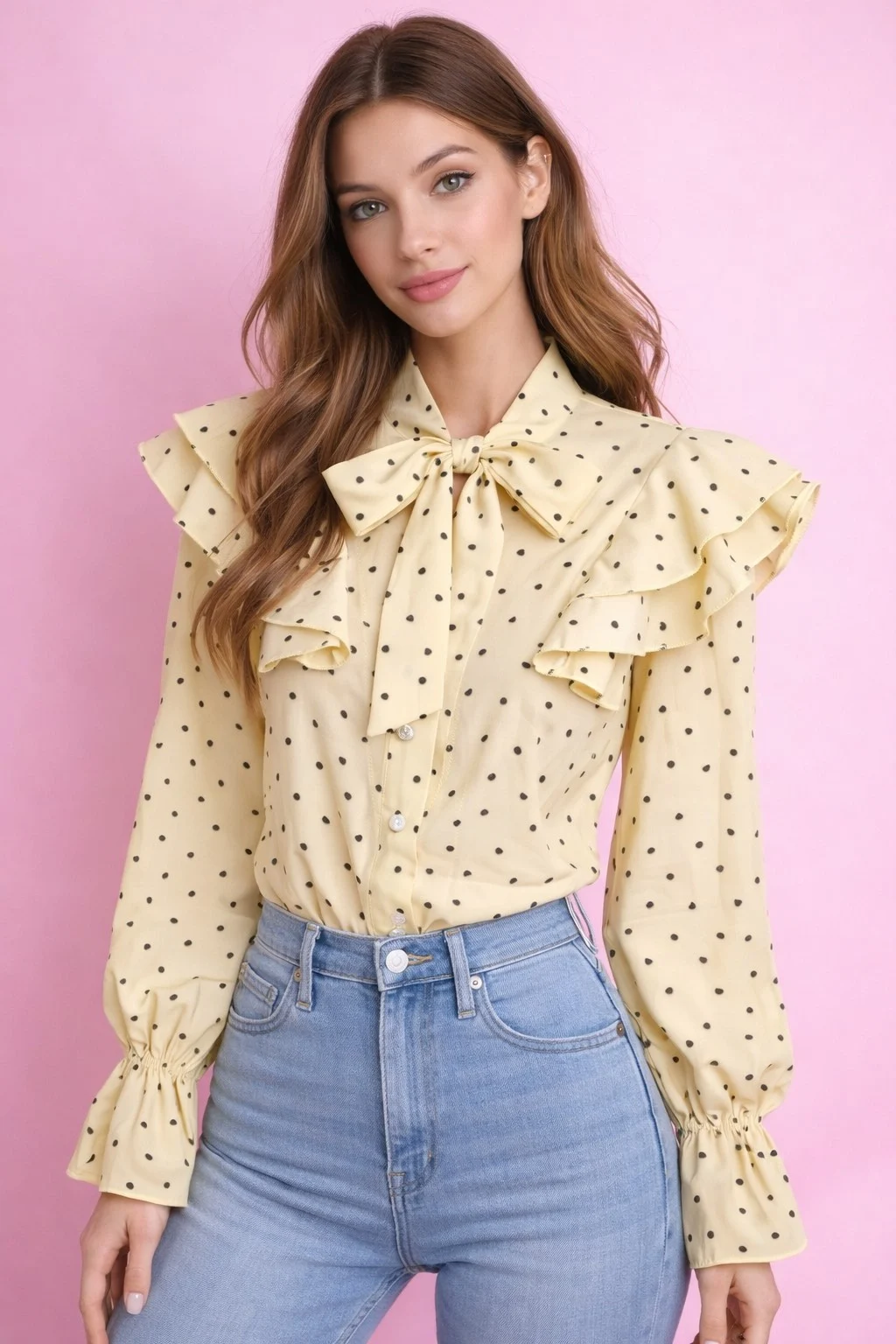 Ρομαντική πουά πουκαμίσα με εντυπωσιακό φιόγκο στον λαιμό και διπλά βολάν στους ώμους για extra girly αισθητική. Διαθέτει κουμπιά μπροστά και ελαστική μανσέτα στο μανίκι για άνετη εφαρμογή.
