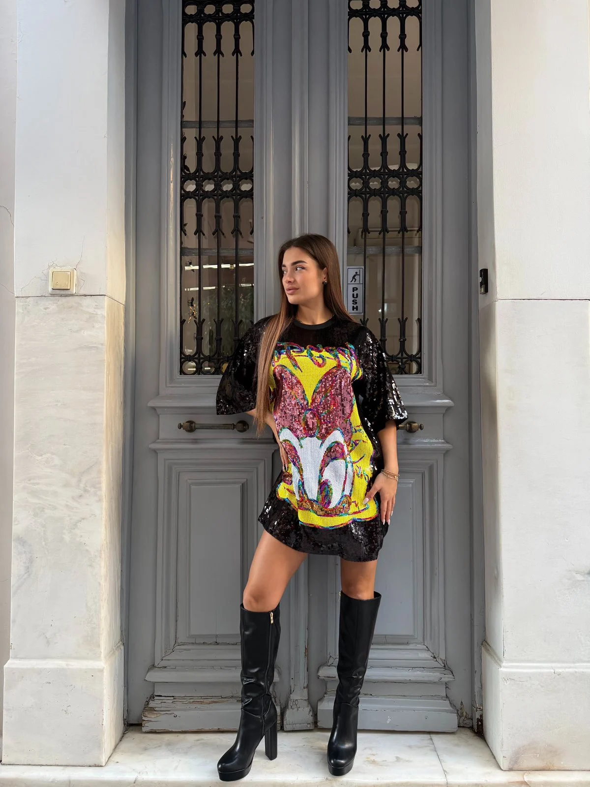 Mini φόρεμα με εντυπωσιακό pop art σχέδιο και παγιέτες που τραβούν όλα τα βλέμματα. Oversized γραμμή για άνετη εφαρμογή και fashion-forward αποτέλεσμα. Ιδανικό να φορεθεί ως mini dress ή και σαν long top με μπότες για δυναμικά, edgy looks.