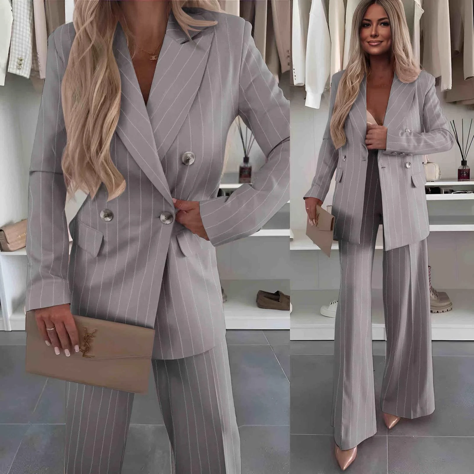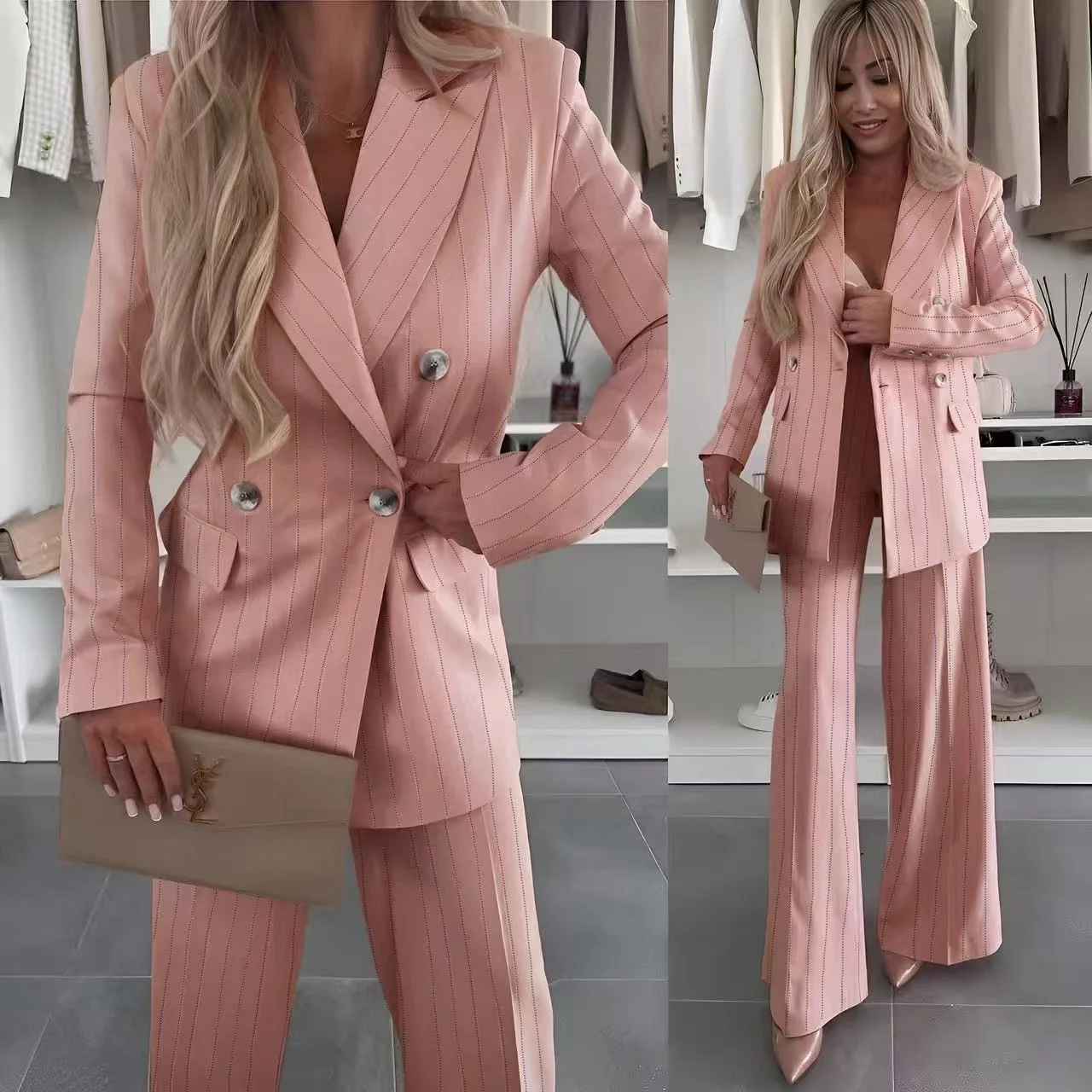 Κομψό σετ κοστουμιού με διακριτική ρίγα που αποπνέει δυναμισμό και θηλυκότητα. Το σακάκι έχει tailored γραμμή που αγκαλιάζει το σώμα, ενώ το παντελόνι καμπάνα χαρίζει ύψος και elegant σιλουέτα. Ιδανικό για all day chic εμφανίσεις, από πρωινό office look μέχρι βραδινό outfit.