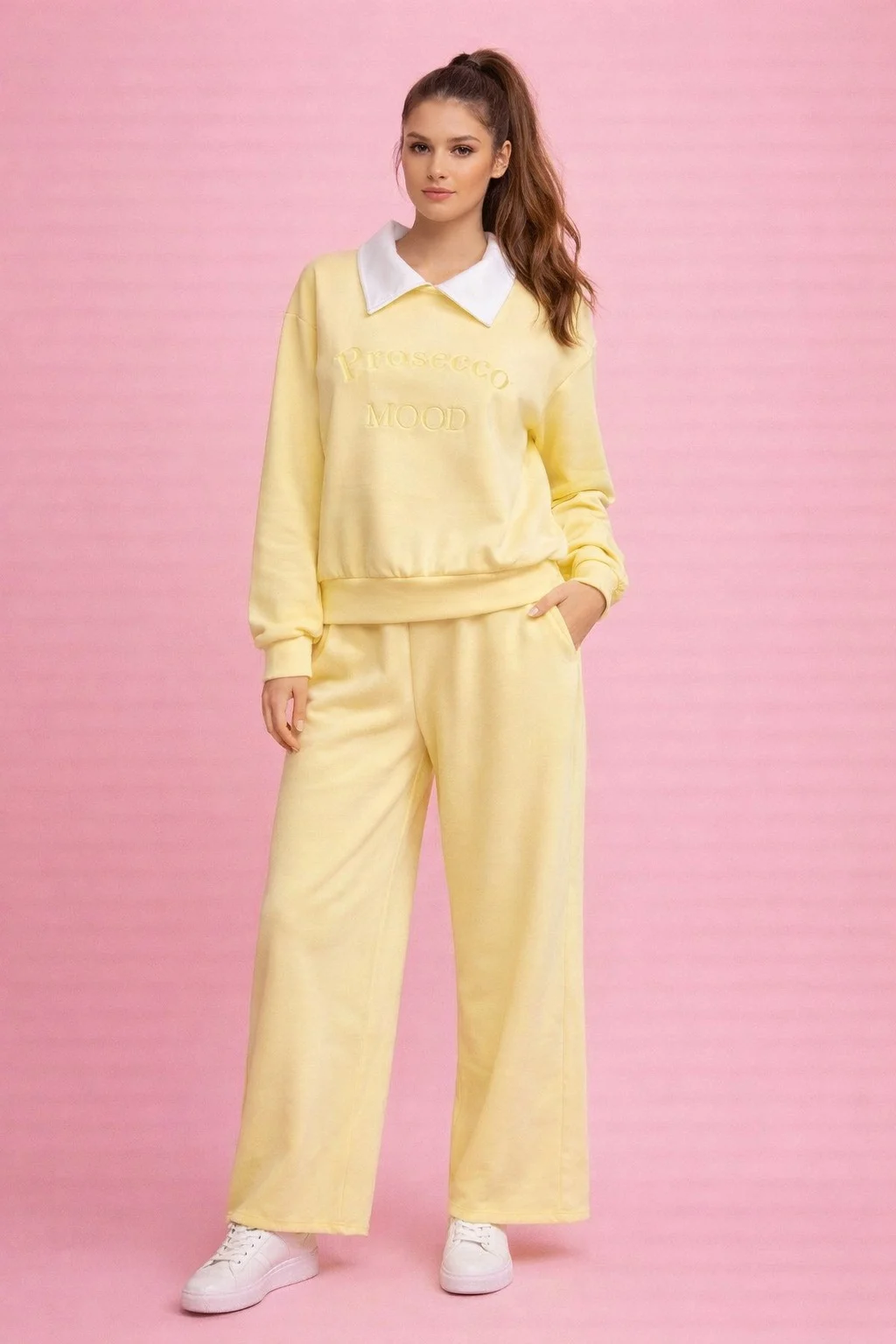 Αποτελείται από φούτερ με γιακά και ανάγλυφη λεπτομέρεια “Prosecco Mood” και παντελόνι σε ίσια, άνετη γραμμή.