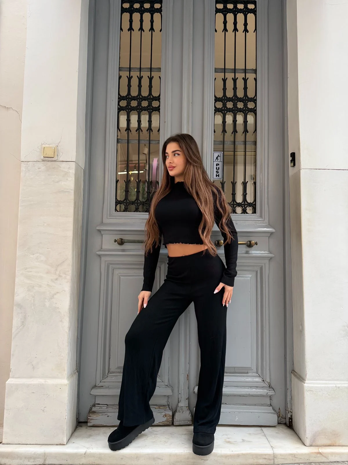 Άνετο και κομψό σετ δύο τεμαχίων από απαλό rib ύφασμα, ιδανικό για καθημερινή χρήση από το πρωί έως το βράδυ. Το cropped top αγκαλιάζει το σώμα χωρίς να πιέζει, ενώ το παντελόνι με άνετη γραμμή χαρίζει ελευθερία κινήσεων και άψογη εφαρμογή. Φοριέται εύκολα τόσο μέσα στο σπίτι όσο και έξω, συνδυάζοντας στυλ και άνεση σε κάθε εμφάνιση.
