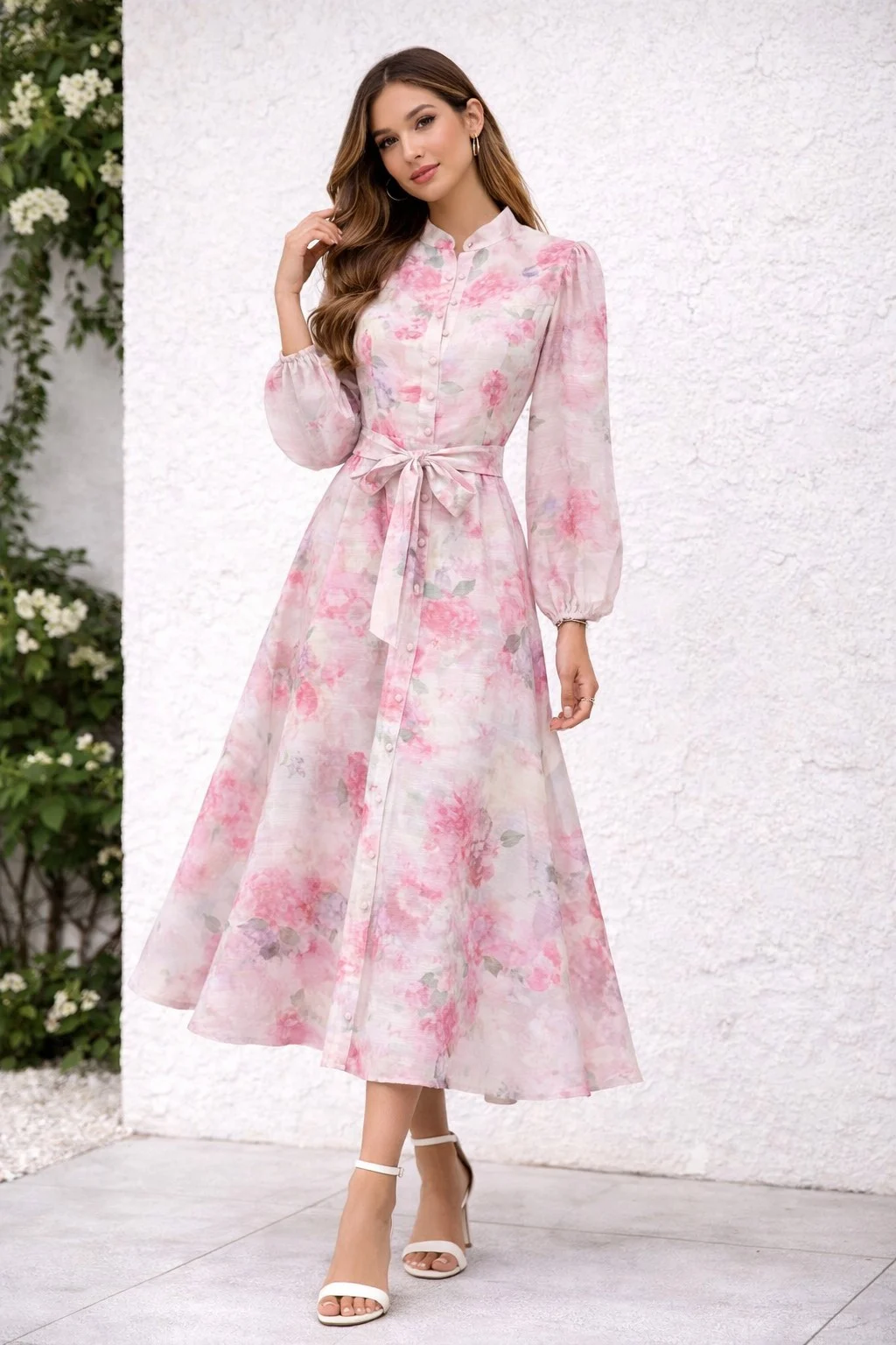 Αέρινο maxi φόρεμα με ρομαντικό floral print σε ροζ & γαλάζιες αποχρώσεις. Διαθέτει κουμπιά στο μπροστινό μέρος, ζώνη στη μέση για τέλεια εφαρμογή και μακριά μανίκια με ελαφρύ όγκο που χαρίζουν κομψότητα. Ιδανικό για καθημερινές εμφανίσεις αλλά και πιο chic εξόδους.