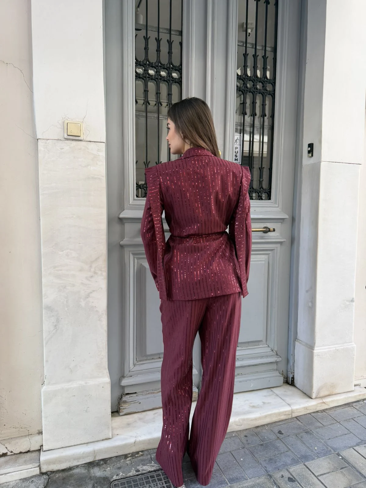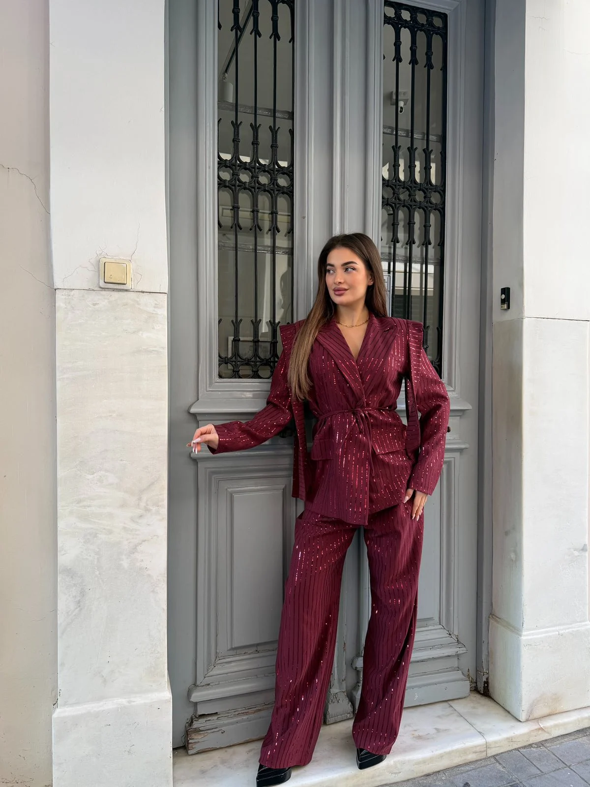 Κοστούμι που τραβάει τα βλέμματα με τις λαμπερές λεπτομέρειες και τη δυναμική του γραμμή. Το σακάκι δένει στη μέση χαρίζοντας σμιλευμένη σιλουέτα, ενώ το γιλέκο δίνει επιπλέον στιλιστικό βάθος. Το παντελόνι σε ίσια γραμμή ισορροπεί άνεση και κομψότητα. Ιδανικό για ιδιαίτερες περιστάσεις και fashion εμφανίσεις.