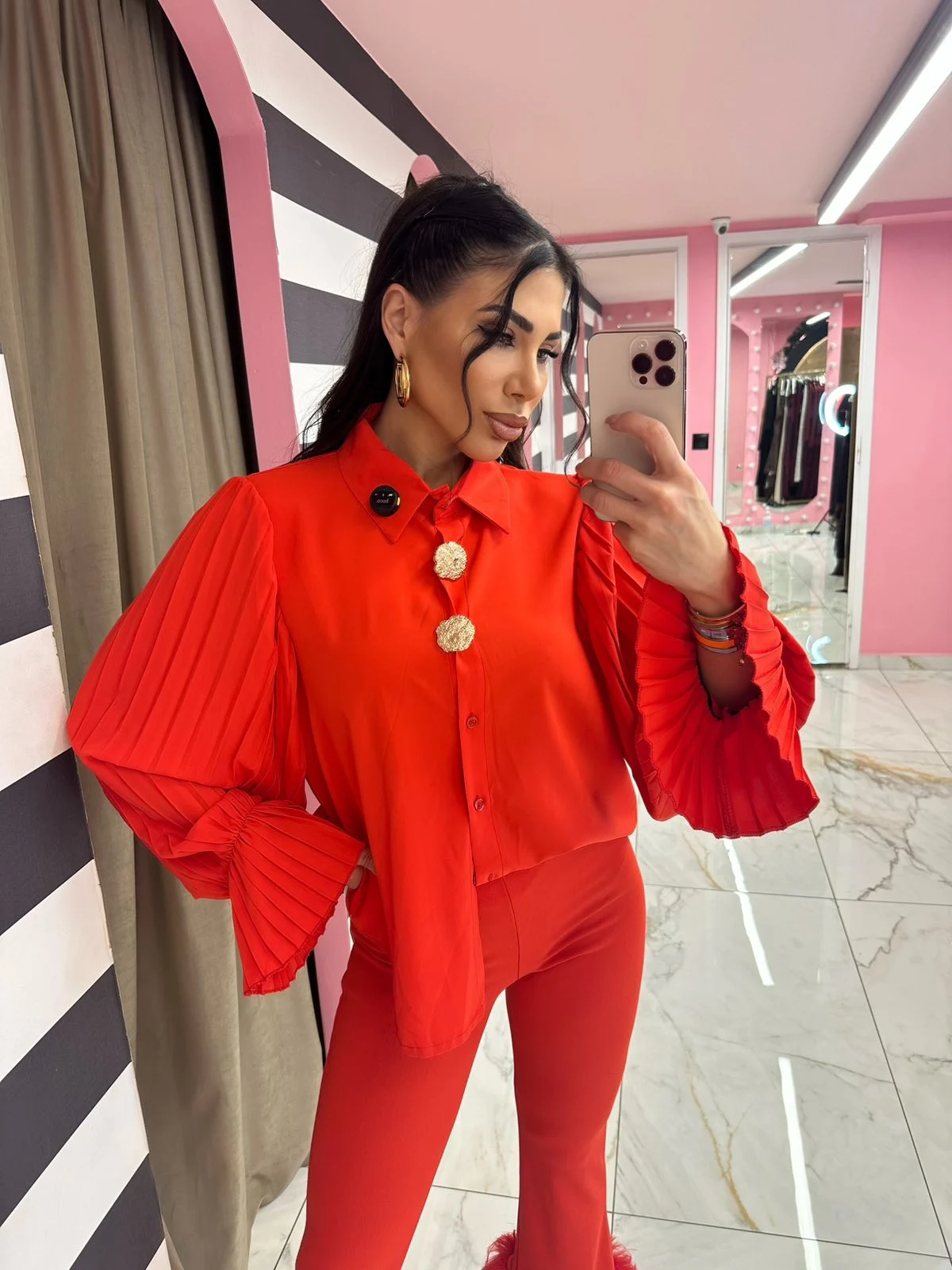 Εντυπωσιακό πουκάμισο σε έντονο κόκκινο χρώμα με πιέτες στα μανίκια και statement χρυσά κουμπιά. Κομψό και θηλυκό, ιδανικό για εμφανίσεις που θέλουν να ξεχωρίζουν από το πρωί μέχρι το βράδυ. Φοριέται άψογα και μέσα από παντελόνια ή φούστες.