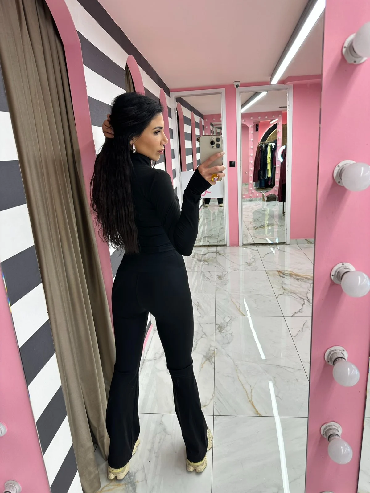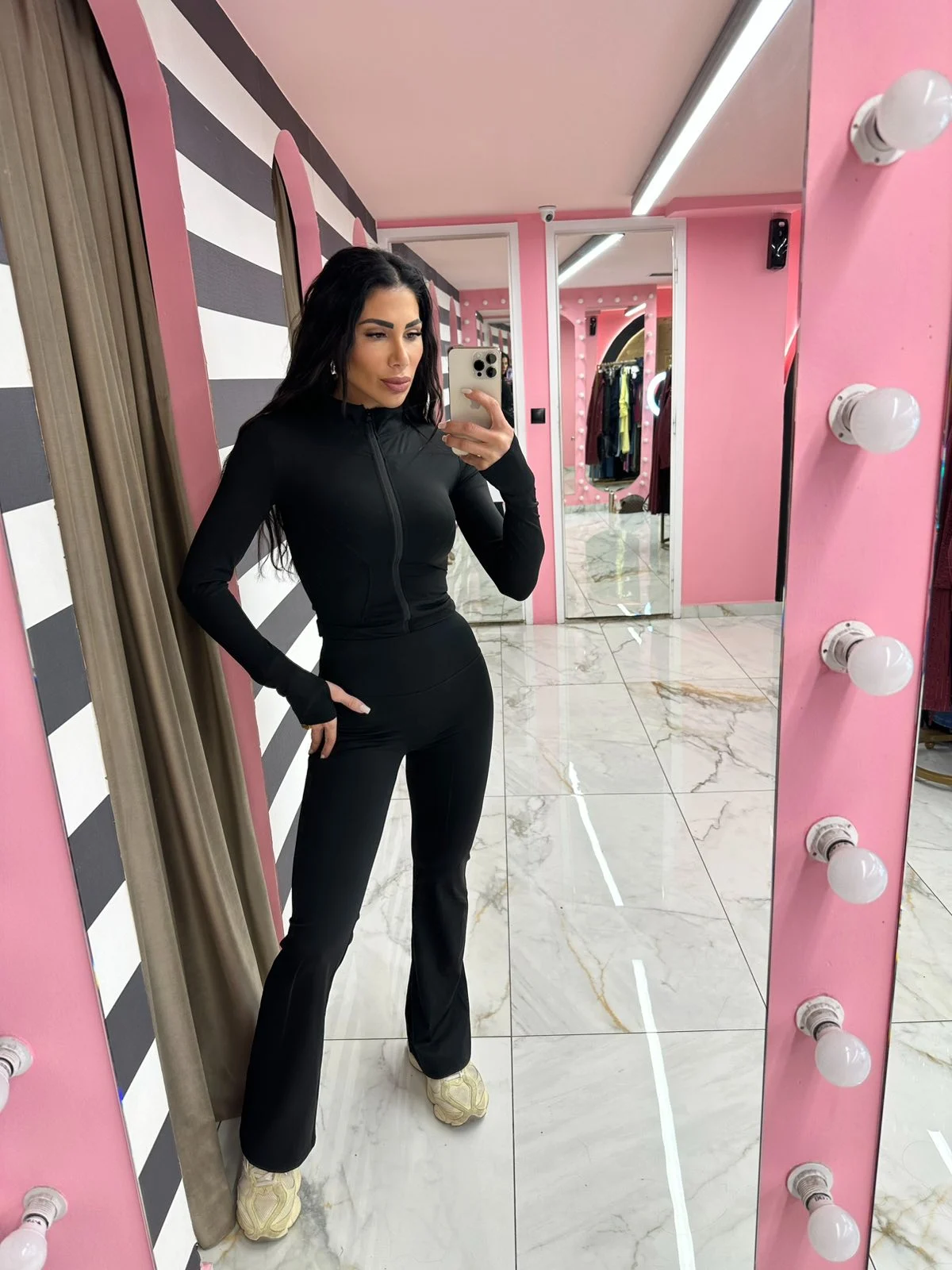 Ελαστικό, εφαρμοστό σετ που αγκαλιάζει το σώμα και τονίζει τη σιλουέτα. Η ζακέτα με φερμουάρ και ψηλό λαιμό δίνει sporty αλλά θηλυκό ύφος, ενώ το παντελόνι σε καμπάνα γραμμή μακραίνει οπτικά τα πόδια και προσφέρει άνεση όλη μέρα. Ιδανικό για καθημερινές εμφανίσεις, ταξίδια ή athleisure looks με sneakers.