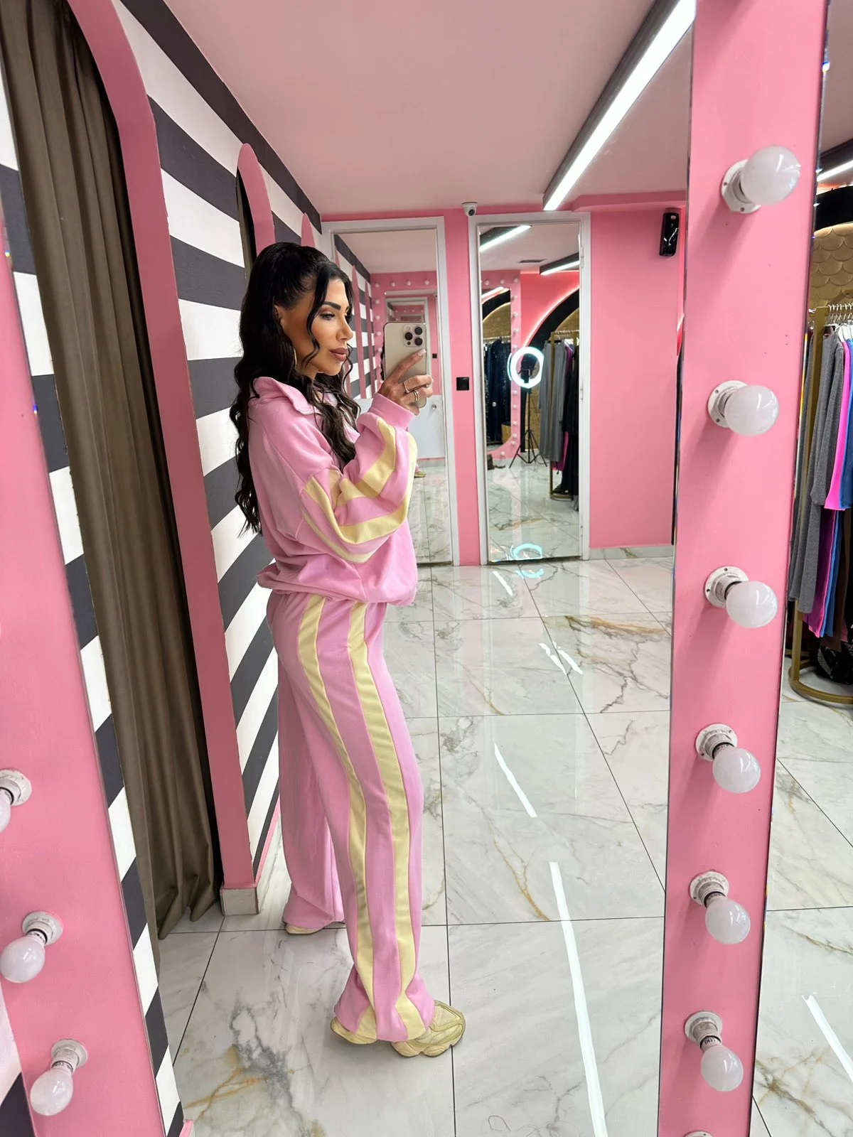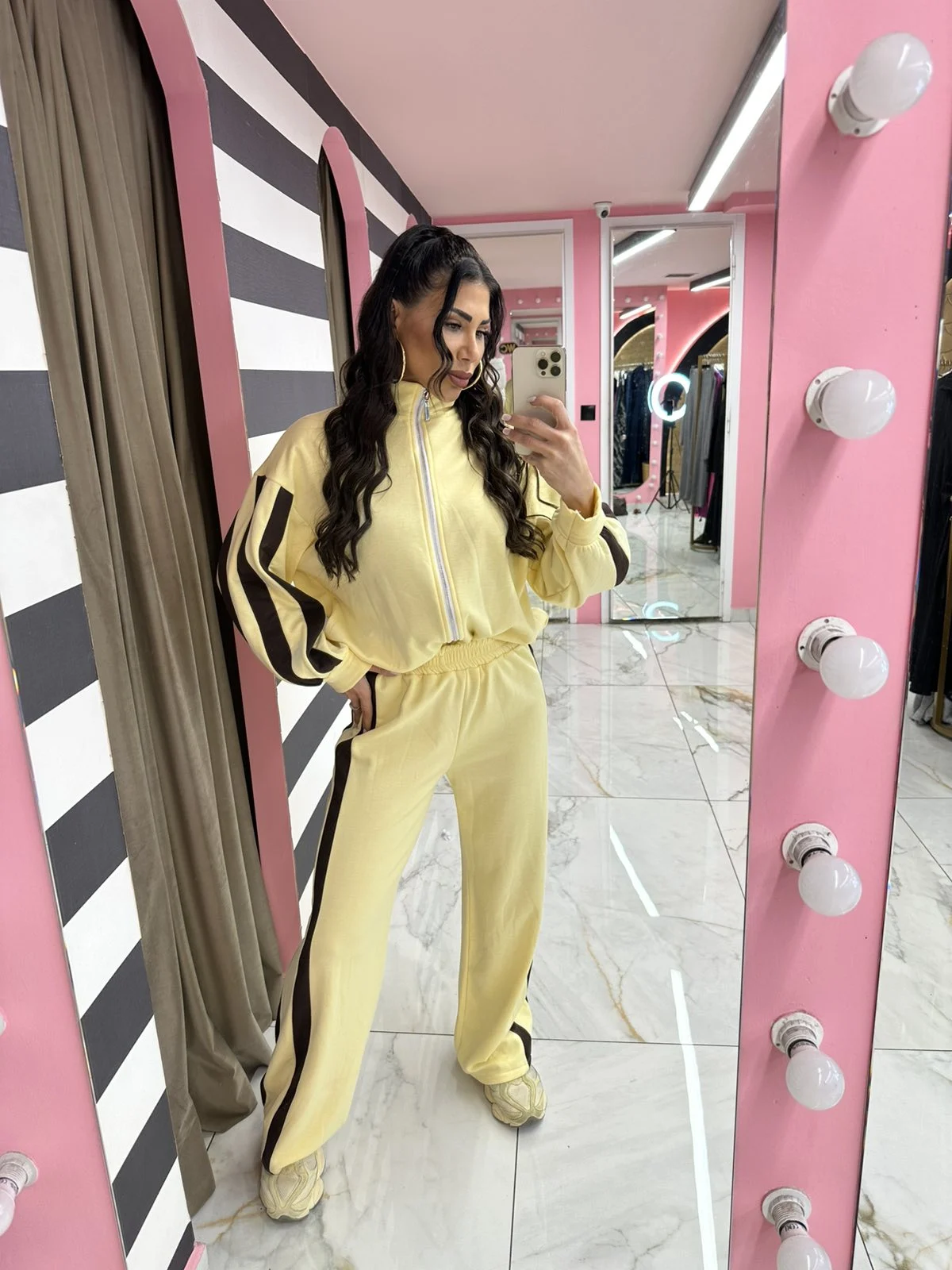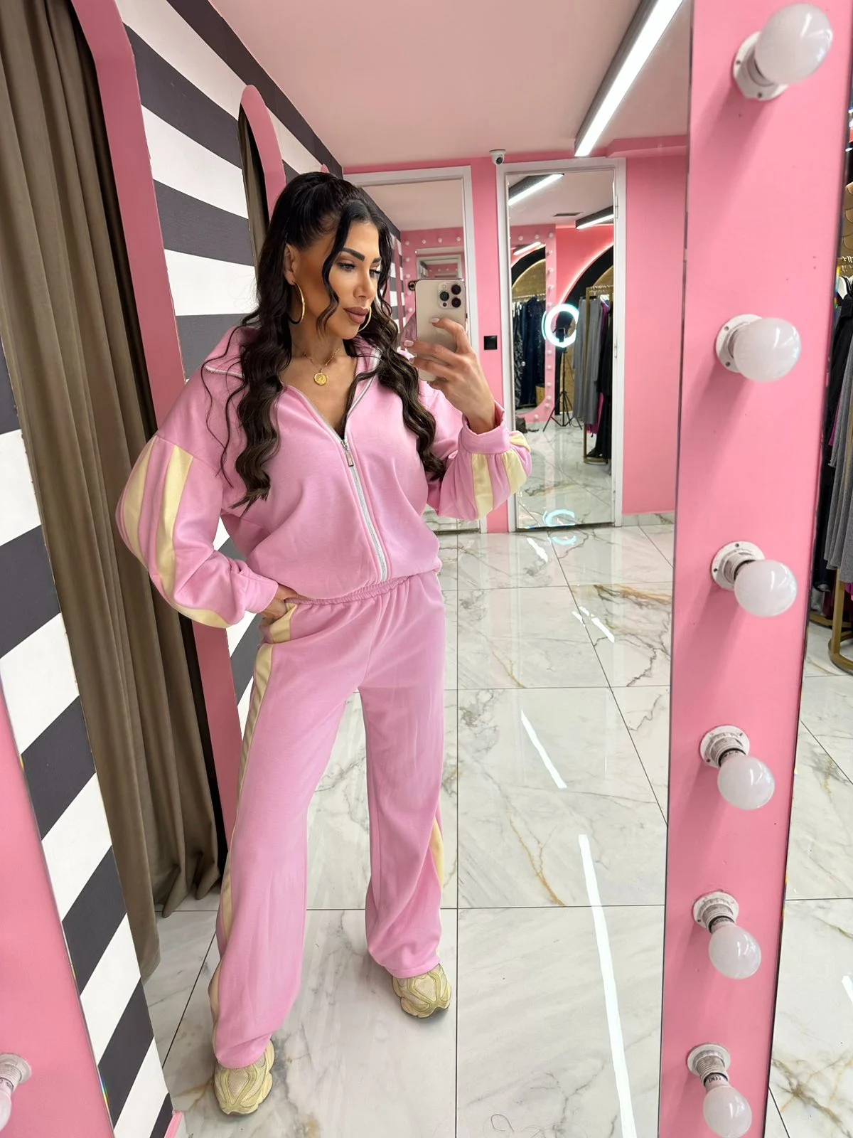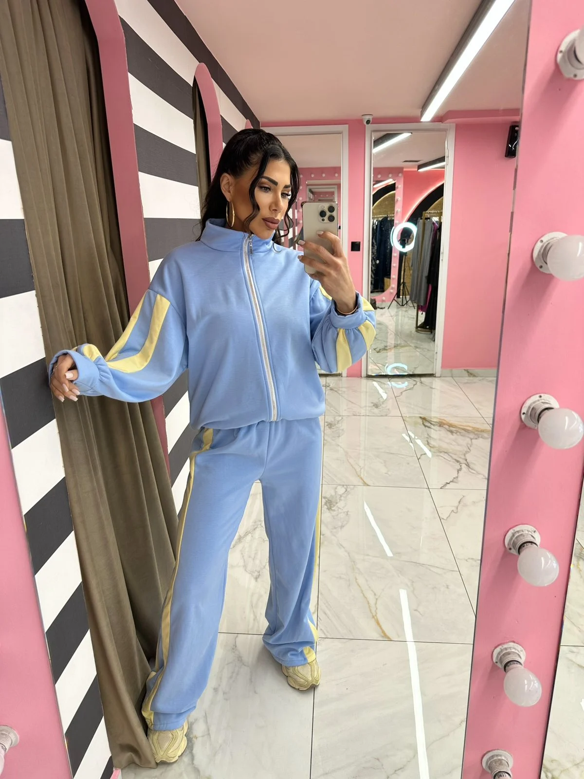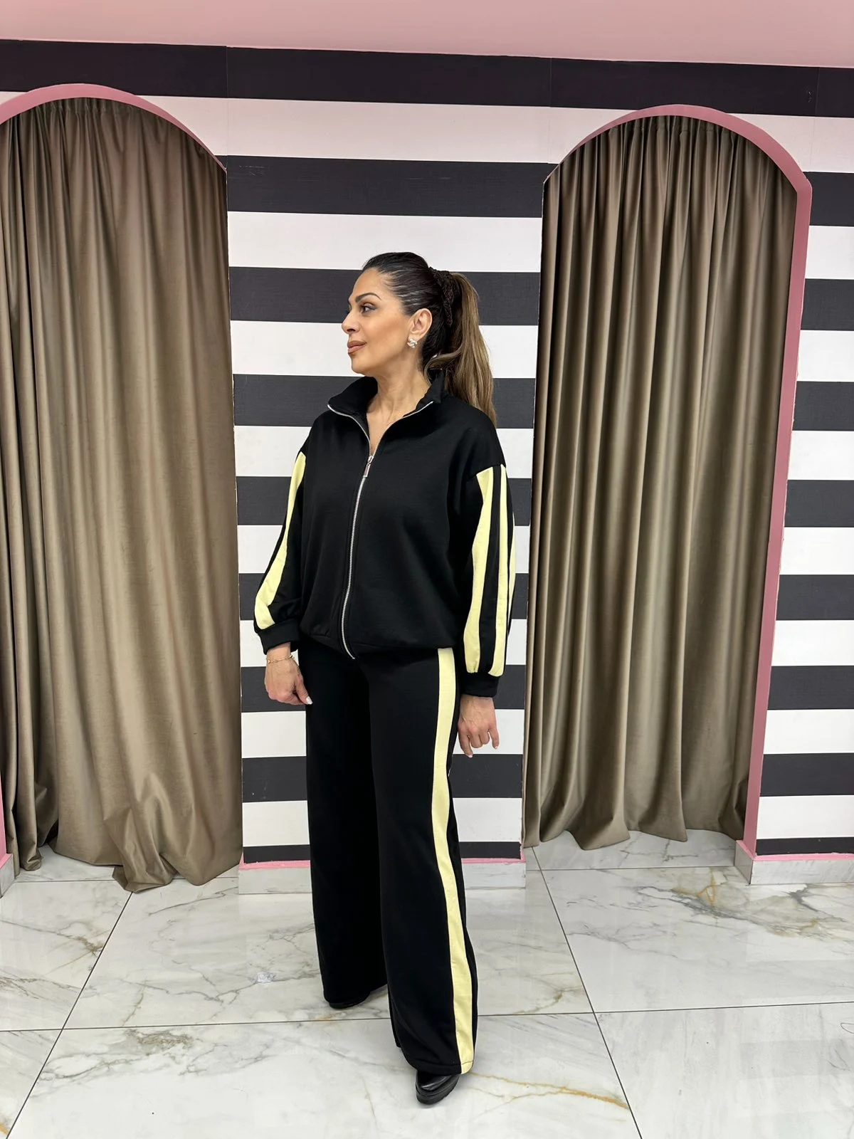 Άνετο και στιλάτο σετ φόρμας, ιδανικό για κάθε στιγμή της ημέρας. Αποτελείται από ζακέτα με φερμουάρ και παντελόνι με λάστιχο στη μέση, προσφέροντας άψογη εφαρμογή και ελευθερία κινήσεων. Οι διακριτικές ρίγες στα μανίκια και στο πλάι του παντελονιού χαρίζουν sporty chic χαρακτήρα, ενώ το μαλακό ύφασμα το καθιστά ιδανικό για καθημερινή χρήση, βόλτες αλλά και ταξίδια.